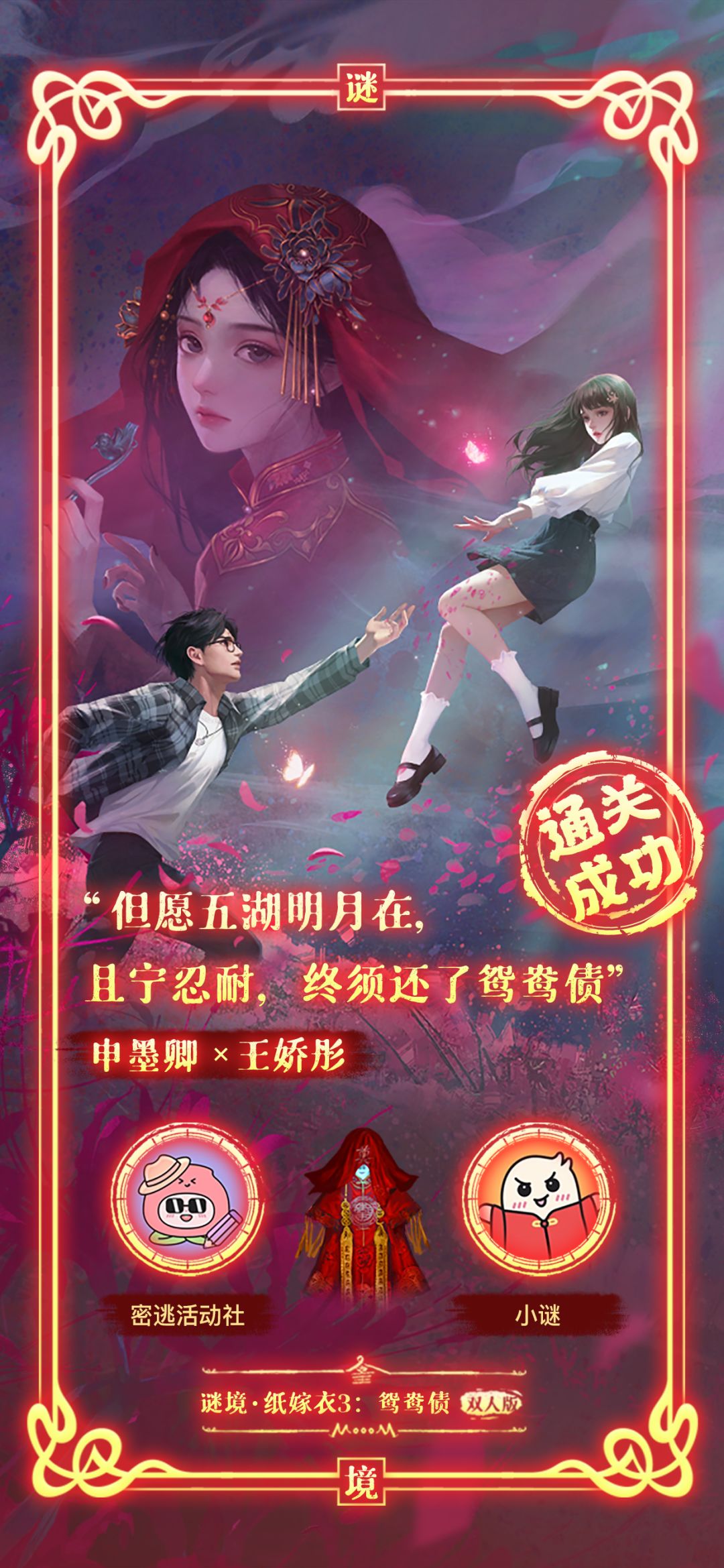 恭喜以下中奖用户,请尽快点击链接填写收件信息!超过规定时效奖品将作废,感谢配合哟~ 用户ID--30916340 用户ID--31971370 用户ID--34350479 用户ID--596203216 分割线 全新玩法,双人探秘 中式悬疑,双人共解 阴阳相隔,双人入境 谜境&纸嫁衣双人版12月28日隆重上线! 准备好和你的搭子“共入谜境”吧! 纸嫁衣鸳鸯债双人版 开启预约! 晒预约截图即有机