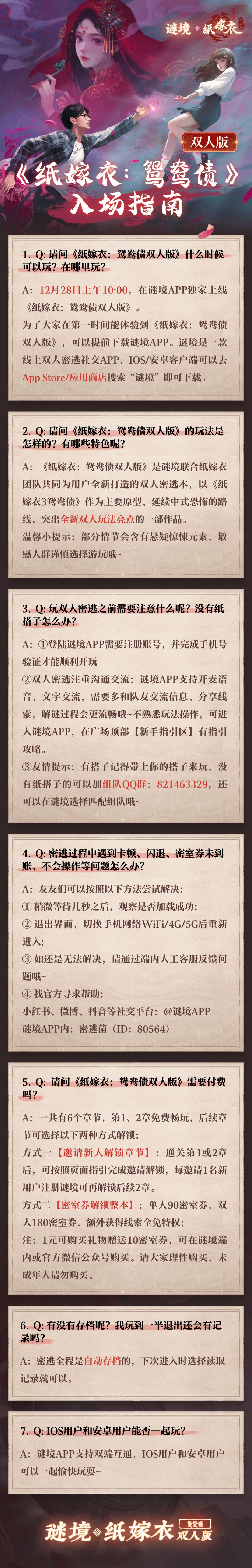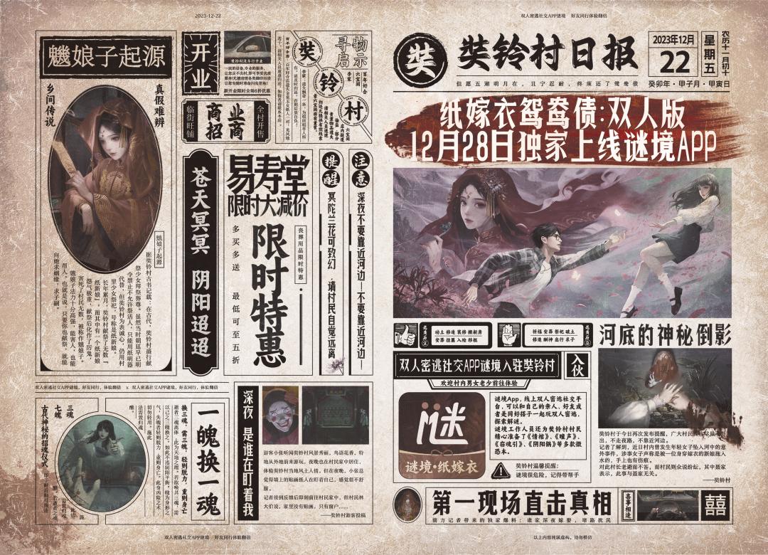 各位纸谜们: 由纸嫁衣原班人马出品打造的“纸嫁衣鸳鸯债双人版”已入驻“谜境APP”,将于12月28日独家上线!双人版现已开放预约!各位纸谜们可点击预约! “纸嫁衣鸳鸯债双人版”是一部延续中式恐怖的路线、突出全新双⼈玩法亮点的作品。主创团队在原版鸳鸯债的基础上,扩展了多个全新的解谜场景,并且还有神秘场景返场重现。双人版需要两个玩家一起进行游戏,极大增强互动性和趣味性,希望能给大家带来全新不一样