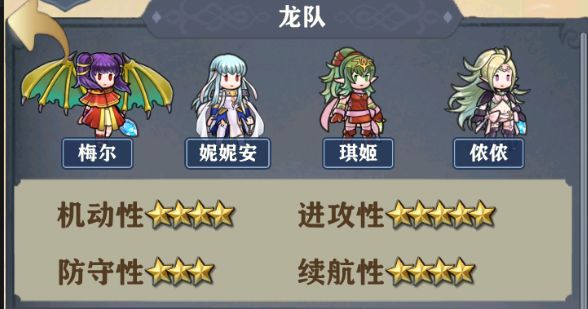 推荐阵容-- 龙队想要既要,又要嘛?那小编推荐龙队,有着让人羡慕的进行性,还有灵活的机动性,又有持续的续航性,是不是做到了既要又要呢? 先从我们的阵容特征,龙队有比较优秀的能力,兼顾机动性和续航性,走位灵活并且提供持续的技能输出,当然作为注重输出的职业,必然是脆皮的。龙族英雄都具有非常优秀的输出能力,这里我们以琪姬举例普攻技能虽然射程较短但是拥有较高的威力属性,威力越高,伤害越高,并