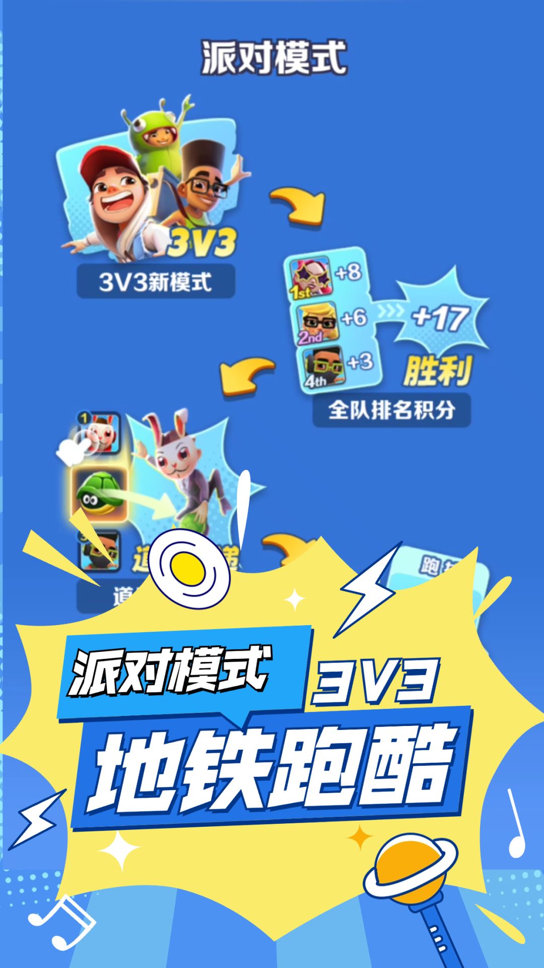 地铁跑酷:3V3组队道具赛,场内场外双助力,派对模式解析!