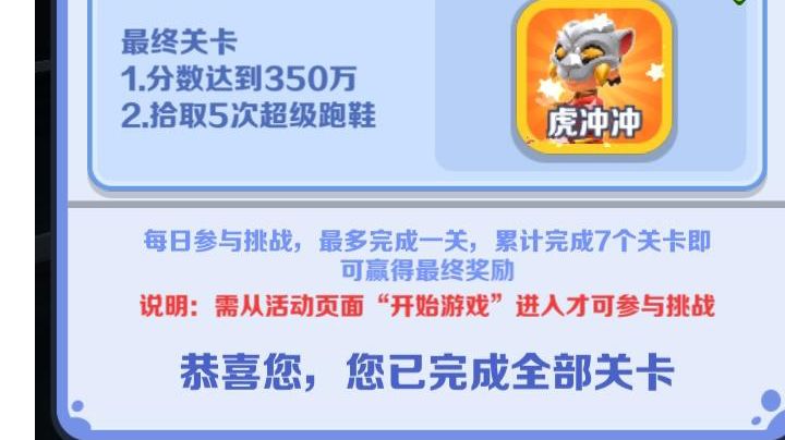 超级跑者活动解读,虎冲冲和大家一起过元宵 哈喽大家好,我是凤雪,超级跑者已经在今天上线啦,活动时间内登陆游戏参与通关,每日闯一关,连续七天通关即可免费获得虎年纪念人物【虎冲冲】 ⏰活动开启时间:2月3日(本周五)-2月19日。 这期活动有眼尖的小伙伴已经发现了,第二天的任务奖励是奥特曼限定头像框,官方也是听取了大家的意见把渠道服缺少的头像框也给补上啦,这波官方大大是真的细节😜 我今天就给大家讲一下超级跑者应该怎么快速完成吧。 目前的超级跑者活动都是跑分数与跑金币,由于这期角色虎冲冲并没有固定搭配的滑板🛹,因此我们可以选择有极速和超级跳跃的怪兽来完成任务。 宝物:跑分数的话就使用嫦娥的兔子+黄金甲+机械手表 跑金币的话可以把黄金甲换成南瓜,有火焰纹章的话可以把机械手表换成火焰纹章,这样的话即使是收集8000金币也只要10-20分钟就可以跑完啦。 好啦这期的解读就给大家分享到这啦,在这里提前祝小伙伴们元宵节快乐🎉
