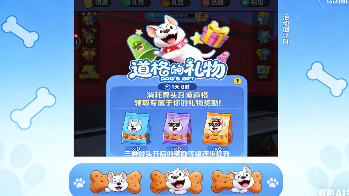 马上就2026年了,提前祝大家新年快乐,新年新气象,地铁跑酷也同样如此哦,接下来让我们来看看冰雪奇境上线的新活动《道格的礼物》吧!一.活动规则如图所示,投喂给狗狗不同的狗粮会有不同奖励,且逐步递升,普通狗粮官方会通过邮件发放,而高级和金冠狗粮则需要花钱购买礼包。活动规则是不要选到有炸弹的杯子,主要靠运气。tips:如果被炸弹炸到可以选择看广告(触发次数不定)或花费跑酷币复活二.活动解析相