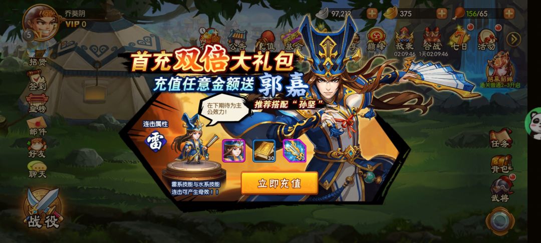 一、核心玩法解析 1、武将收集与养成 (1)、获取途径:通过招募、活动兑换(如巅峰演武)、碎片合成获取武将,优先培养赵云、孙坚、魔吕布等核心角色 (2)、升星与装备:消耗同名碎片升星提升属性,搭配「遁甲天书」「孙子兵法」等专属装备强化技能效果 2、技能连携与阵容搭配 (1)、水雷队(中后期主流):张春华+吕蒙+孙坚,利用水雷属性叠加触发范围伤害与控制 (2)、定斩队(前期过渡):张飞+典韦+甄姬,