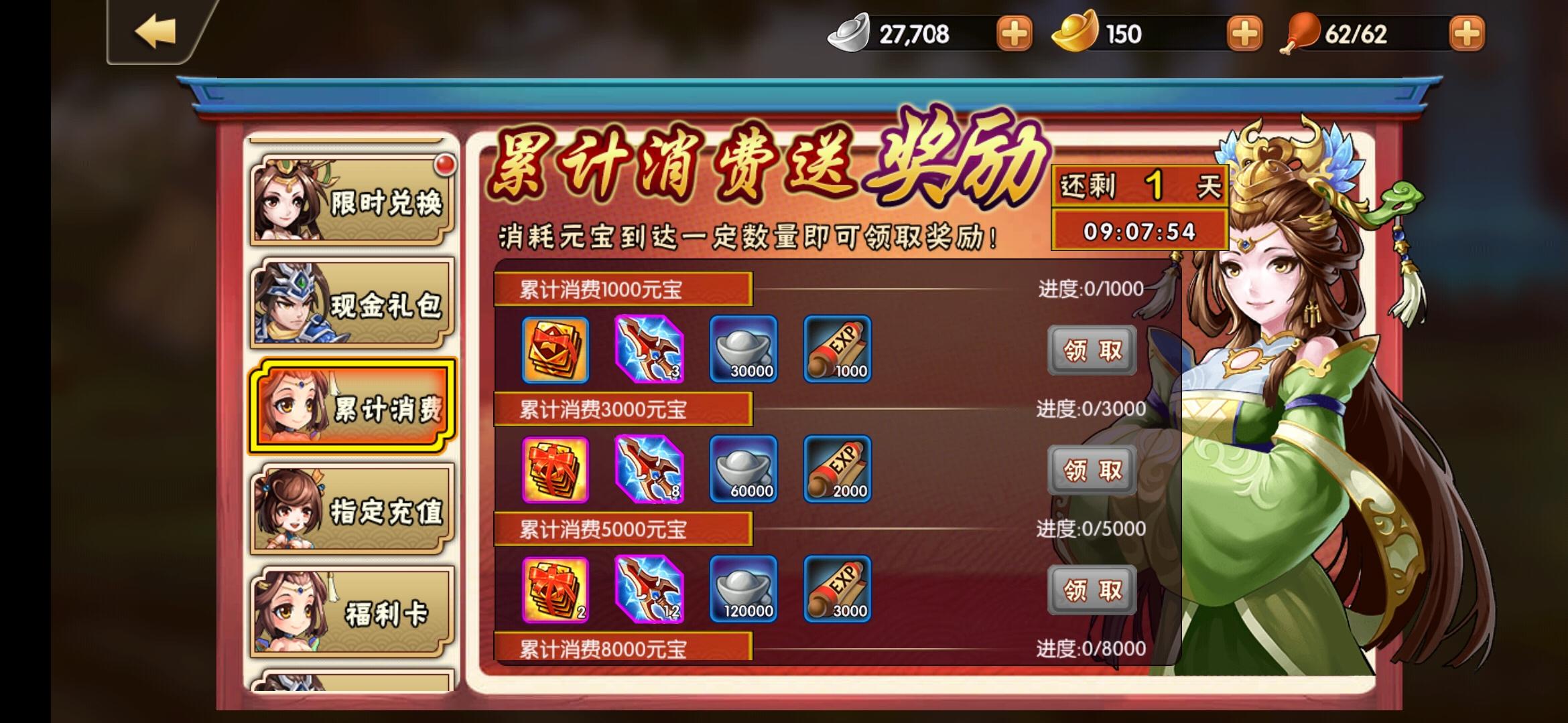 1、整点宝藏:提前1分钟进入到战役界面,我一般锁定第4、11章。如果并没有出现在锁定的章节,也可以看到左右翻页剪头上提示的文字从而快人一步。 2、后宫临幸:卡时间。中午12点前几分钟把10次临幸用了,12后又刷新10次,小R玩家再买俩次,完美获得40分三级宝石箱。此方法同样适应于晚6点刷新。 3、武将碎片:如果想每天极限获得一个武将碎片(扫荡可得),可以先扫荡别的精英关卡1到2次,再扫荡你想获得的