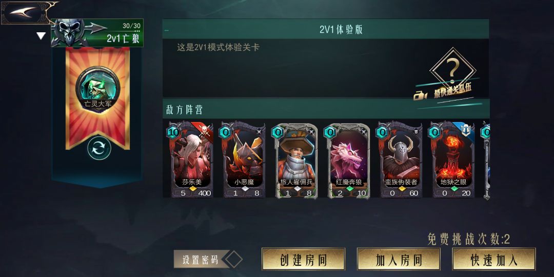修改于 2019-3-5. 你们的点赞就是我的动力谢谢。 大佬们都写种族,竞技场,天梯攻略了,现在我给大家写一个2v1攻略。 这篇攻略针对于2v1体验(第一关) 。 这里的建议是 亡灵加人族。 因为我自己和一个懂点点打的话胜率是百分百。 解析: 萌新认为2v1难打的原因就是因为开局招惹蛮族伪装者(每被攻击一下增加1点攻击3点命)。 首先介绍卡组 人族:法力喷泉 带卡思路:输出主要靠亡灵,负责堆建筑