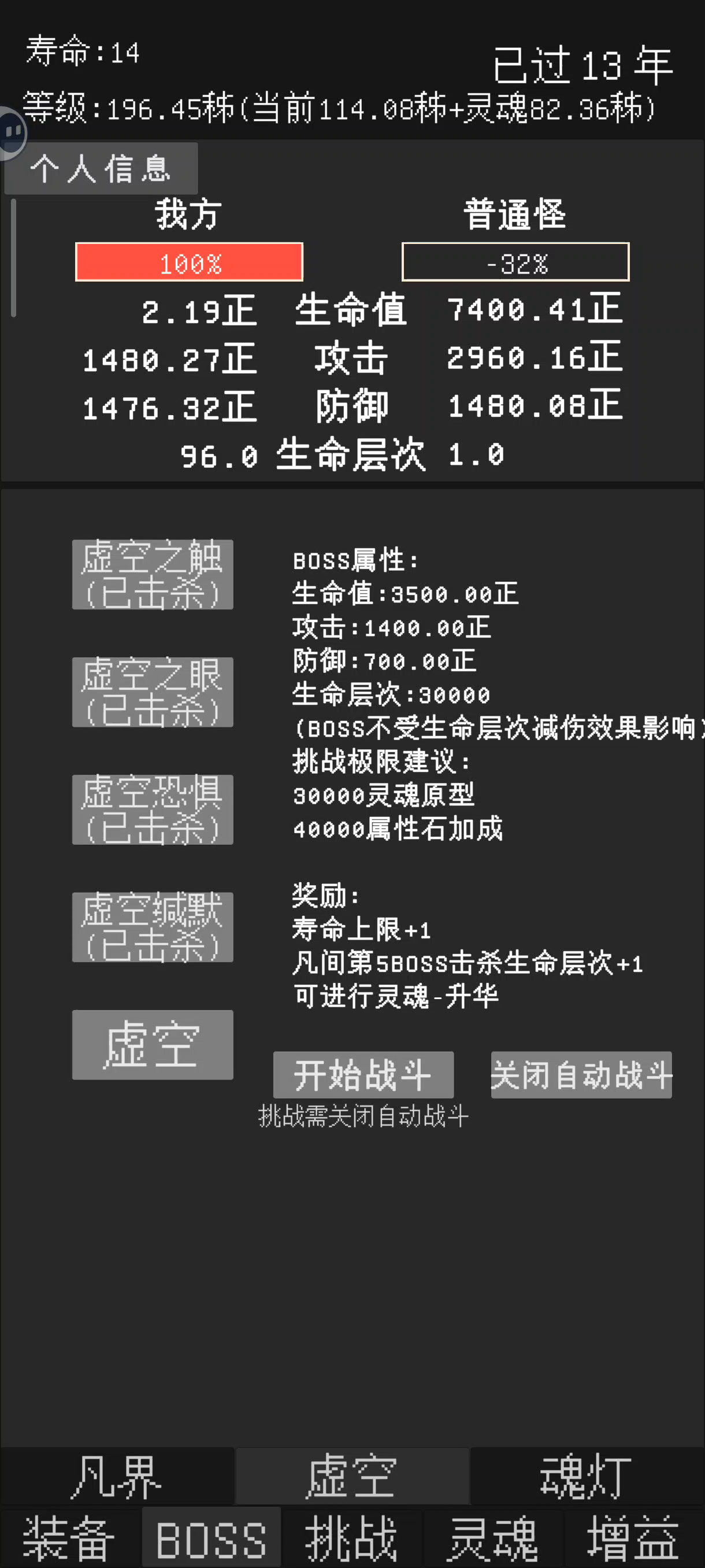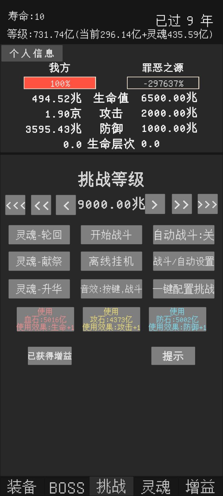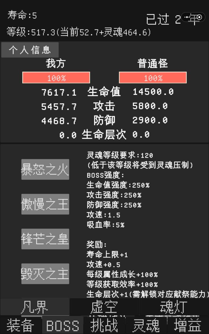 目前300h魂灯400层,分享一下经验以及游戏里面的坑(尤其是升华的坑!!!踩中升华的任何一个坑都会浪费很久时间!)不管做什么,都要有广告时间的增益,不然速度会很慢!记得每次上线先把广告看满(目前广告最大持续时间为86400s,也就是一天)第一次献祭前人物等级=当前等级+灵魂等级,等级越高属性越高。当前等级可用于购买装备,但是轮回之后会清空;灵魂等级则会保留。所以在寿命用尽后、还没轮回前,