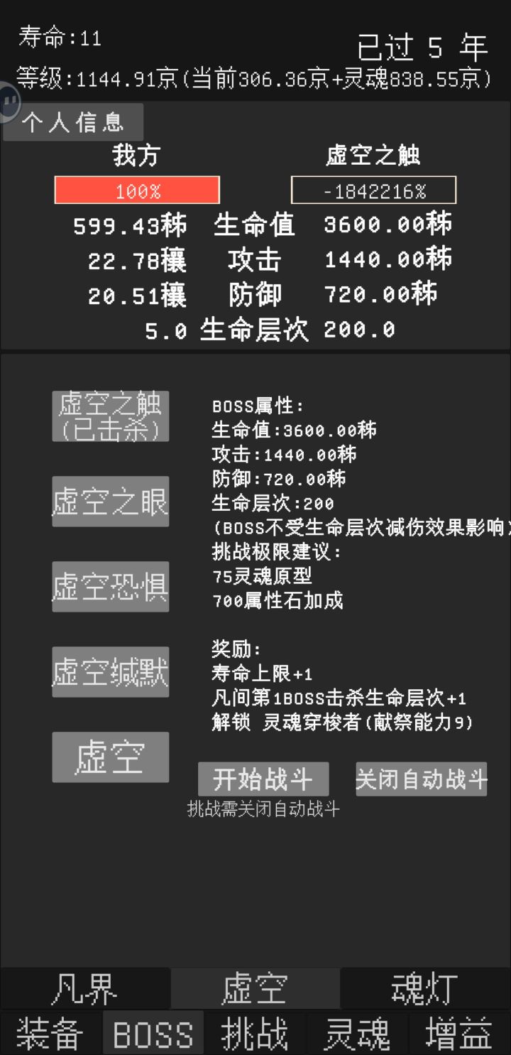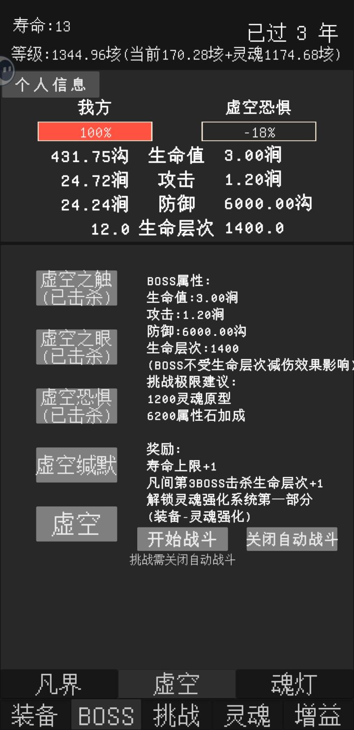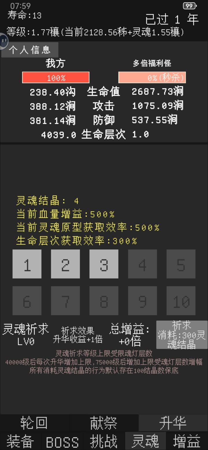 目前300h魂灯400层,分享一下经验以及游戏里面的坑(尤其是升华的坑!!!踩中升华的任何一个坑都会浪费很久时间!)不管做什么,都要有广告时间的增益,不然速度会很慢!记得每次上线先把广告看满(目前广告最大持续时间为86400s,也就是一天)第一次献祭前人物等级=当前等级+灵魂等级,等级越高属性越高。当前等级可用于购买装备,但是轮回之后会清空;灵魂等级则会保留。所以在寿命用尽后、还没轮回前,