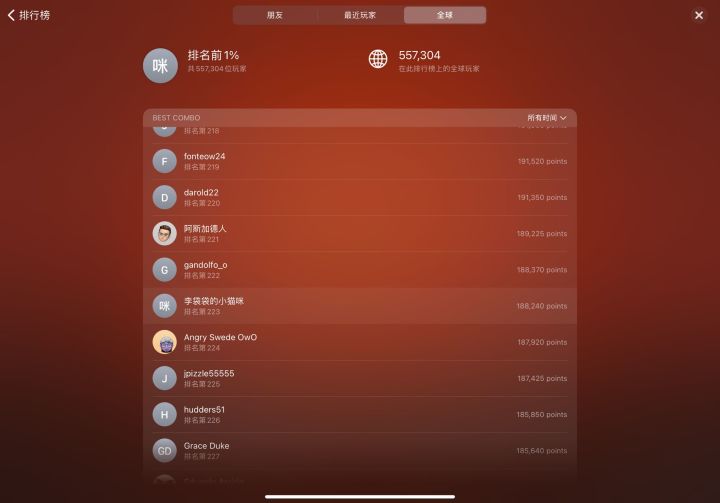 打出一会儿组合之后,本来打算留意一下屏幕右侧,瞅瞅我的滑墙加成还在不在,结果竟然瞟到了已经做了54个组合动作了!一瞬间心情激动,最后完美落地记录分数!直接把6000+的排名提高到了223!(game center里的第三个榜)
