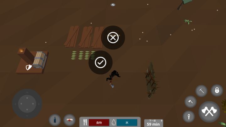 Ⅳ【防御技巧】这个游戏也没什么防御技巧 ~不过 神器 只要遭受攻击 ,之后每波的黑僵尸 就不会再来了 ……改说成游戏经历 ~神器左上的房子里的一些材料 ~〖绷带 木材 木板〗商店已经焕然一新 …… 完全不知道 水晶 的用途…… 应该是基地右下的新建筑 ……以及选择上面的 开始按钮后 的 怪物们…… 完全不理我 …… 在那附近有一堆【树枝】,需要自行砍伐~这是树枝的主要获取方式~只要点击这样看似枝繁叶茂的树的 绿叶 部分 ,【树叶】便会飘落 ~ 神器右边 沙漠绿洲的地图 中的书 砍倒后也会有 树叶掉落 ~【硫磺】【铁】以及一点箭~还需要自行砍树 、挖矿 ~【土壤】:6树枝 + 6树叶 。用于种植食物 ~上图原英文为 Has seed. 意为 已有种子 !【肉架】:10树枝 。用于晒肉 。 最多摆放7块~ 不能无限次吃…【钉鞋】:4树枝 + 4木板 。尖端对着僵尸才能造成伤害~ 伤害极高,不过建筑自身也会受到伤害……【天空的陷阱】:6木板 + 12钉子 + 3石头.一次性道具 ,毕竟是陷阱 …… 伤害 ? ? ?【防御塔】:10木板 + 10金属片 + 10钉子 + 3齿轮 。人物3级 解锁 ~弹药无限 ,射程和弓箭一样 ~ 到第二波就失守了……虽然只被打了几下 还能修复 ;不过没僵尸再来送肉了……这个是目前的布局 ……玩创作模式应该更轻松……