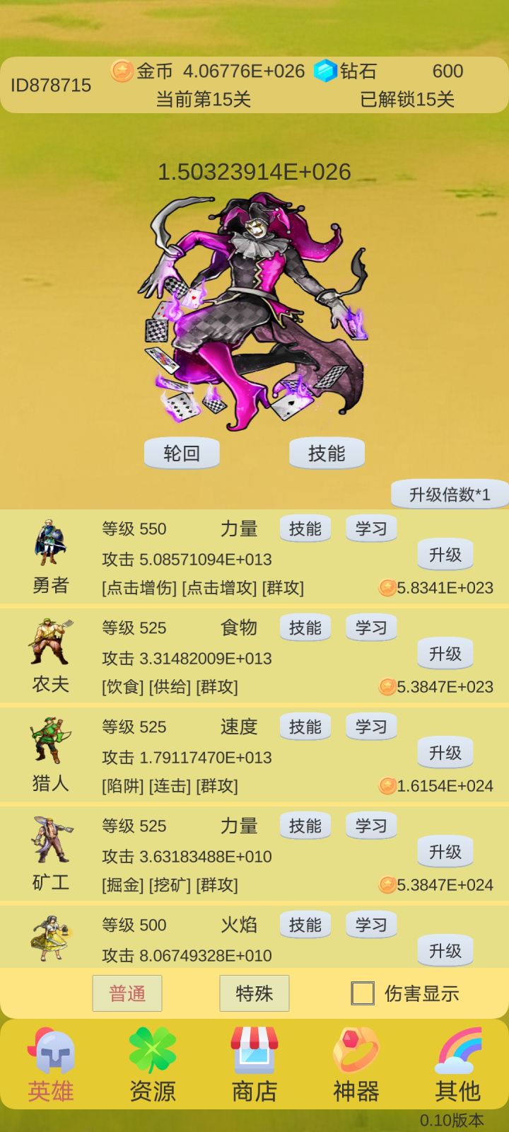 这是一个叠量的游戏,也是一个单机游戏,没有太多的套路,不断的极限层数后,轮回就好以下是部分说明英雄篇英雄分为两种,普通和特殊普通英雄:通过关卡解锁,解锁后就可以永久拥有,轮回清零等级,但可以金币升级,等级无限制,但技能最多拥有3个,每过200级,可以激活技能特效特殊英雄:通过关卡解锁,不过是5的倍数解锁,例如1,5,10,15等,升级需要砖石,目前上限3级,轮回不清空等级,但只有一个技能