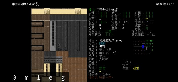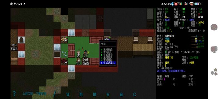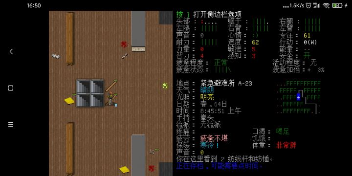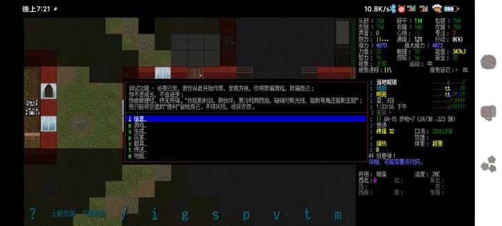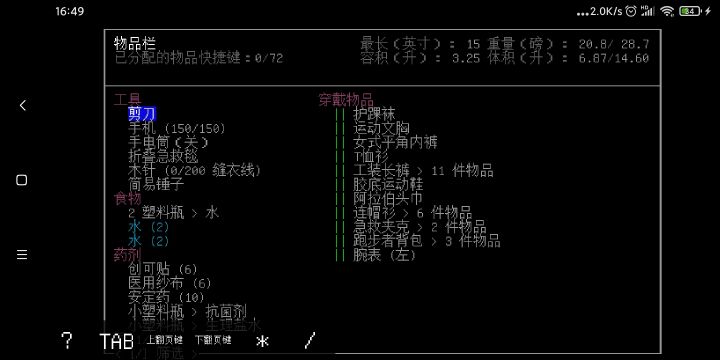 神作下载游戏的途径:1 贴吧2 加QQ群2891183253 直接官网https://cataclysmdda.org/releases/新手攻略:上来直接避难所开局,开局先跟npc对话,看能不能拉他组队。然后按s砸椅子,这时候你就会发现没有s按钮,按返回键既可呼出键盘(注意区分大小写),拿着木板去外面s敲树苗,然后拿长树枝(应该叫这个)先回去避难所,看看能不能造长矛。接着去窗子那按e撕下窗帘,拿去做背包,作两个单臂背包,两个都可以穿上,把柜子里的东西该拿的拿了就把柜子砸了捡铁。最后如果要去城市的话最好晚上再去,不然白天僵尸隔老远就看见你了,晚上悄悄摸,被僵尸追的时候找到房子外面的水管按<爬到屋顶就安全了。觉得屏幕太小的可以到设置里调终端高度和宽度,一定要看见屏幕四个方向的虚线框才能现实全,根据设备的不同调的数目也不同,我的是高度186宽度40可以参考