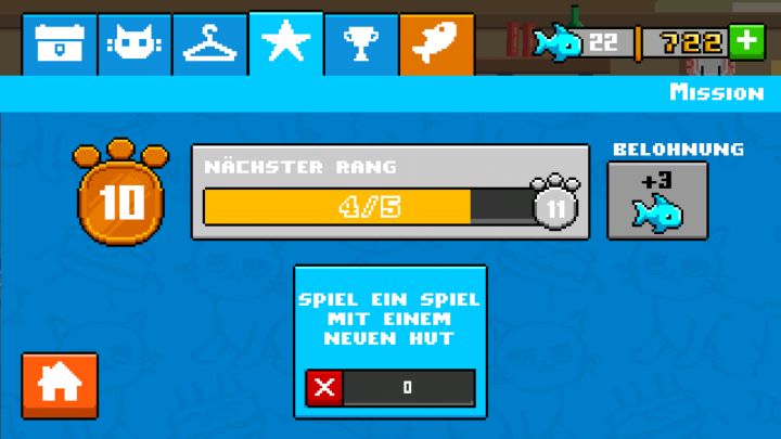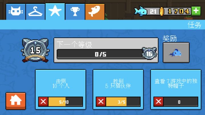 主界面介绍(如上图):点击任意处开始游戏。左上角是设置按键,点击后如下右边按键都没啥用,左边依次是背景音乐、动作声音(包括猫猫头的萌萌叫声)、语言设置(语言设置中中文为灰色不可选所以没啥用)主界面右侧蓝色猫猫头是类似于于仓库按键,点击进去后界面如下图,左上角五个标识的含义分别是猫猫头→选择/购买使用角色、衣架→选择购买装饰、星星→显示当前等级及任务状态、奖杯→记录历史成绩、小鱼→购买充值界面。
