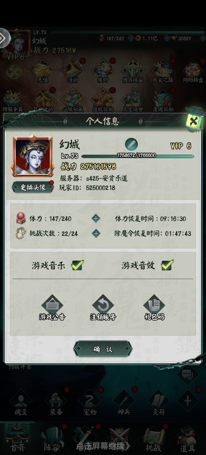 游戏区服425 角色幻城 游戏时间300小时很好玩的一个游戏,玩了十几天,英雄都而且每个阵容都能玩,强烈建议鬼族元宝可以通过打树妖获取,一个星期搞十几万没一点问题,阵容多变,可以自己探索最适合的玩法,最主要的小氪和零氪都能找到自己的方式,零氪玩家熬着也能当大佬。