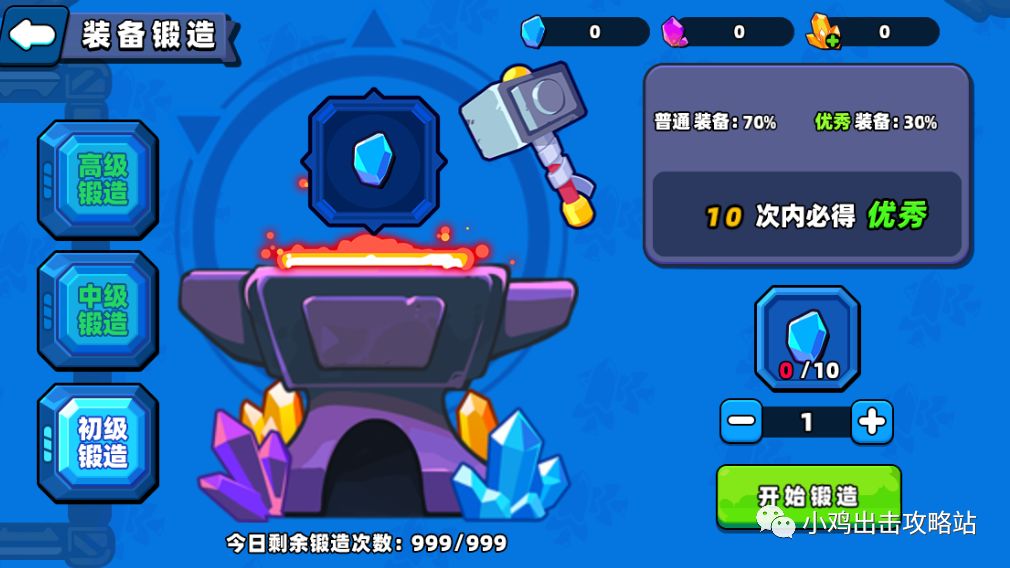 在最近的版本更新中,装备的获取改版了,在不氪金的情况下,只能通过打每日挑战获得固定的装备数且是白色品级的装备,更新后每日挑战变成获得初级锻造石,通过锻造石获得装备,那么新的装备改版是利是弊呢,一起来看一看小鸡长的分析! 【装备锻造】是通过使用锻造石去获得装备,总共分为初级锻造、中级锻造和高级锻造。初级锻造石可以通过每日挑战获得,而中级、高级锻造石需要充值拿到。 初级锻造 普通装备:70% 优秀装备