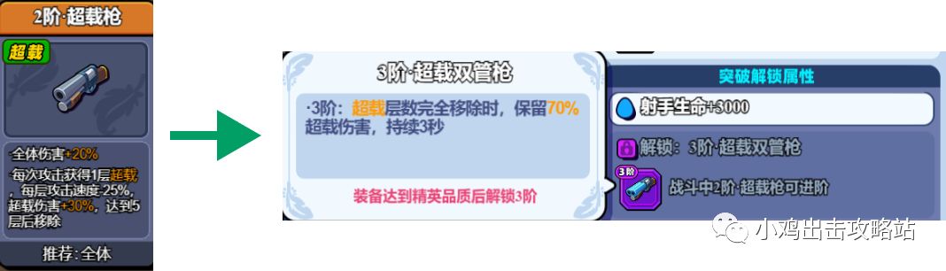 每日挑战快出了1个月了,大伙是不是也有好多3阶装备了吧。今天小鸡长给大家带来全新的系列,解析每个职业的3阶装备。 火热推荐 开局6r获得ss英雄 射手的装备主打一个伤害加成,但是带来的负面影响就是减少很多攻速。所以一般我们选择超载枪和波动枪,如果主C为射手选择弹道导弹,除非玩超载阵容,不用特别选择超载2倍镜。那么在这个基础上我们看看射手的装备到达3阶之后会有什么提升呢?! 3阶超载双管枪 超载层数