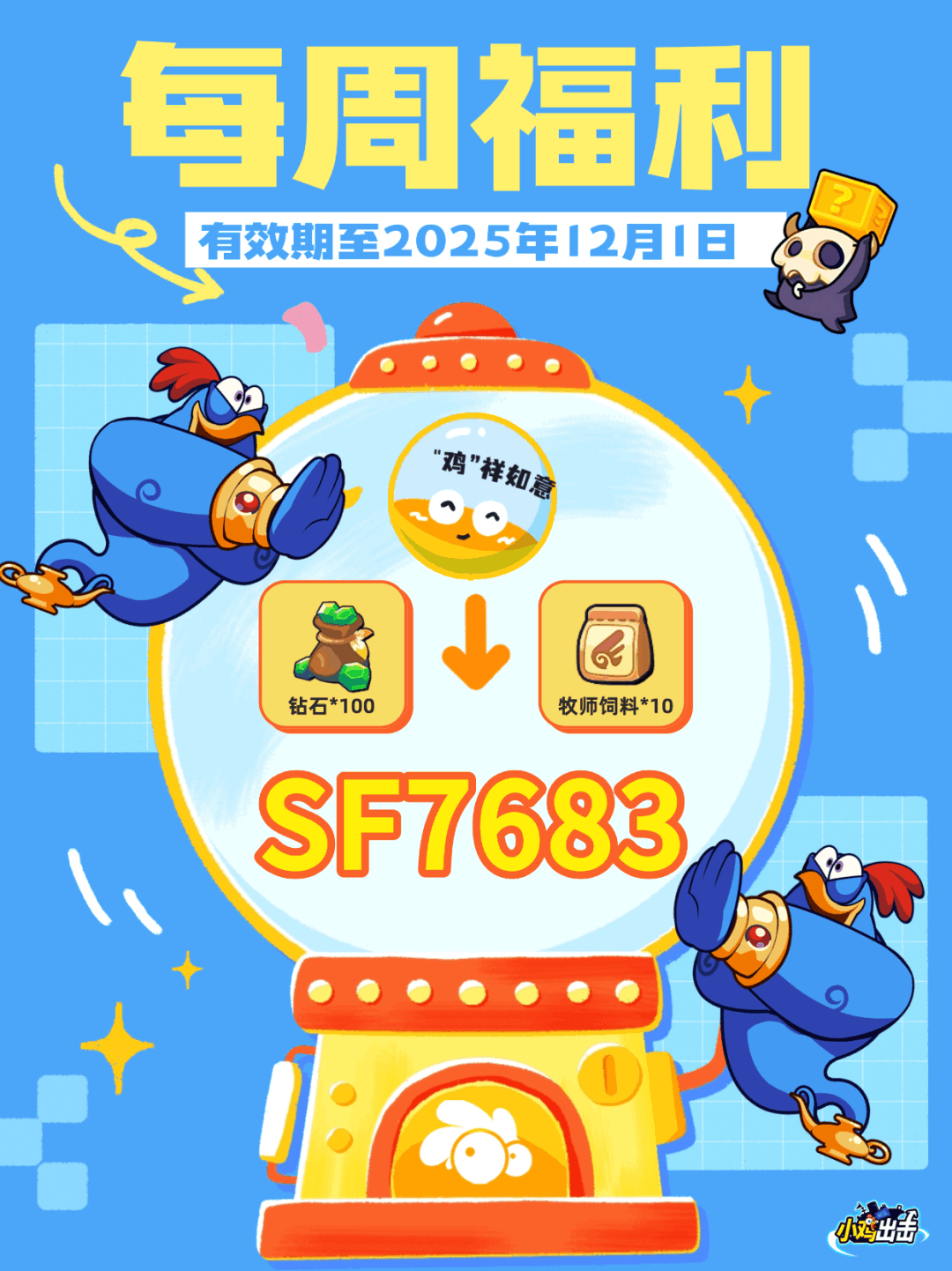 左滑图片,查看本周【阿拉鸡丁】的扭蛋福利码吧!🐣本周福利:SF7683有效时间:2025年12月1日前兑换方式:点击设置-兑换,输入本次福利数字即可兑换【钻石*100+牧师饲料*10】——--———--—— ■🎂《小鸡舰队出击》2周年庆典进行中!本兑换码支持抖🎶、微📧小程序以及手游玩家兑换,其他渠道玩家受渠道限制无法兑换,敬请谅解~#小鸡舰队出击 #游戏福利 #休闲游戏 #今天游戏圈