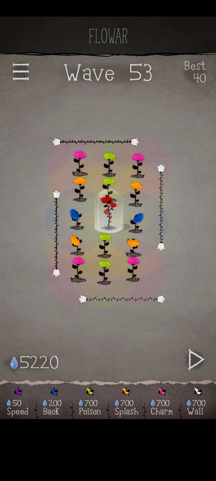 完美阵型如上,大概可以一直撑到第60轮前后,需要注意粉花的血量以及等级。前期主要升级紫花,其它花种统一升至2到3级。后期粉花必须趁早满级,否则崩盘。黄花在粉花满级前后也要满级,用于应对后期虫群。40轮前绿花升级看心情。45轮左右最好全体满级(包括绿花)。50轮是一个大问题,很容易崩盘(因为大虫体型夸张,会蹭到后排紫、黄花),一定要注意全体血量。50轮前后黄花、紫花尤为重要,死一朵立刻螺旋升天。第6