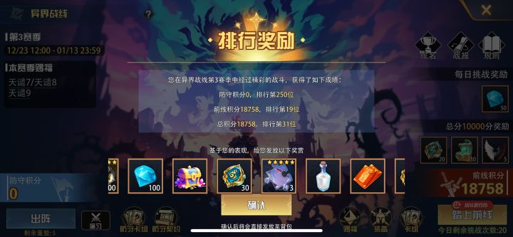 异界战线有个漏洞,就是防御积分配对对手(防御为0,配对到的都是200名左右的菜鸟对手,而防御分5000的攻击对象都是前20名的)一直到1-5号系统才修复这个bug,最后2天开防御不打,还能使前面领先的0防御选手再乱打掉下去(我看见好几个160级左右16000攻击分的掉到几千分,后面每天都输几千,配对正常了,同级别的倒可以升分了)