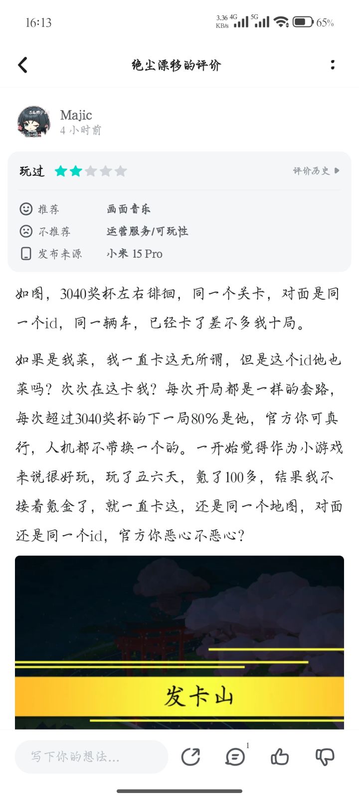 我知道为什么这个游戏不能查询对局记录了,因为官方明着给你安排人机。接上我写的游戏评价,四小时后我又来了,还是一样的关卡对面一样的id一样的车,还是3200奖杯,官方已经明着安排人机在这等了,这还玩什么?氪的那100多真不值。