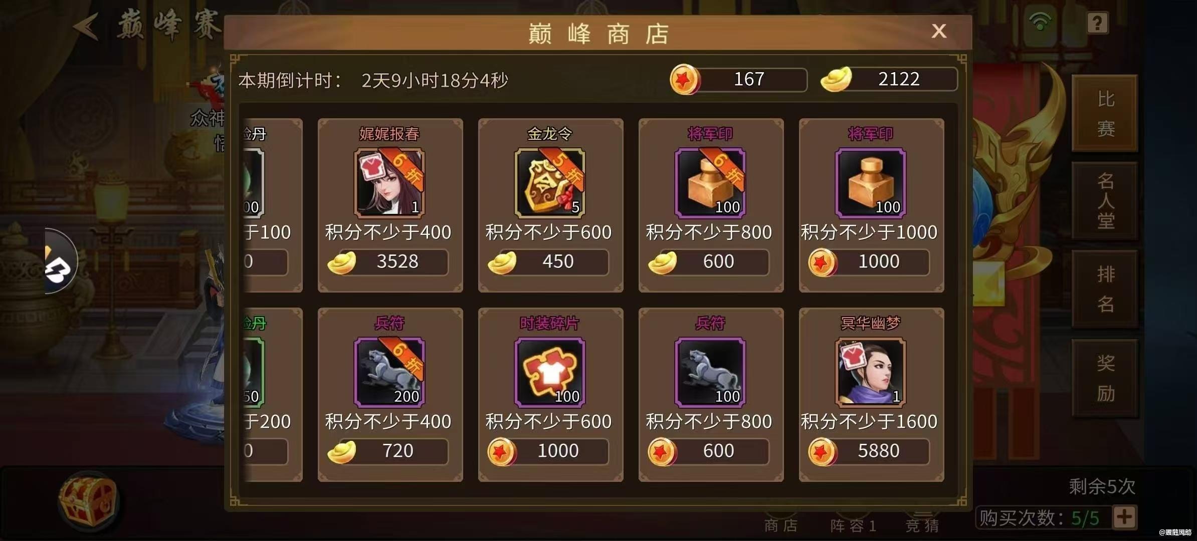 #攻略分享#史无前例的大方? 老铁们,存币,存币,存荣耀币! 这次更新后就可以看到,巅峰商店,可以兑换一系列实用的商品! 如,将军印,援军一系列培养升级的东西! 还有特效皮肤,金龙令,时装碎片,等等,据说每个星期还是一个月更换一次,这点倒是挺人性化! 这样下来,排位赛,积分赛,决斗场,巅峰赛,更加要打了,接下来,荣耀币,感觉更香了,可以兑换很多养成材料了!