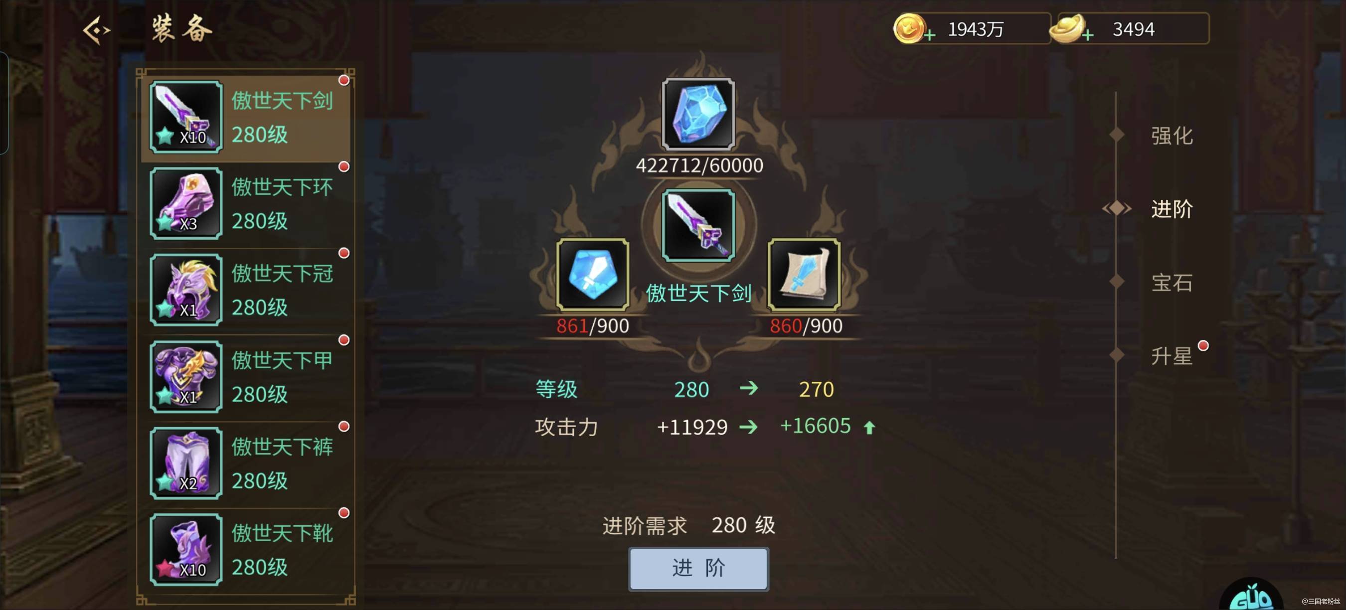 #攻略分享#探宝了3亿金币,总产出道具如下。 剑120把 雷公160个 符100个 神仙笔140个 按几率算,大概就是1000万金币给3,4把剑加符加神仙笔这样,顺手白嫖点宝石,12级攻击快熬出来了。 现在金币产出略低,每天极限做任务,我算过顶多就700多万金币,一个月2亿这样,现在的副本太吃道具了,尤其演武场和攻城高层。