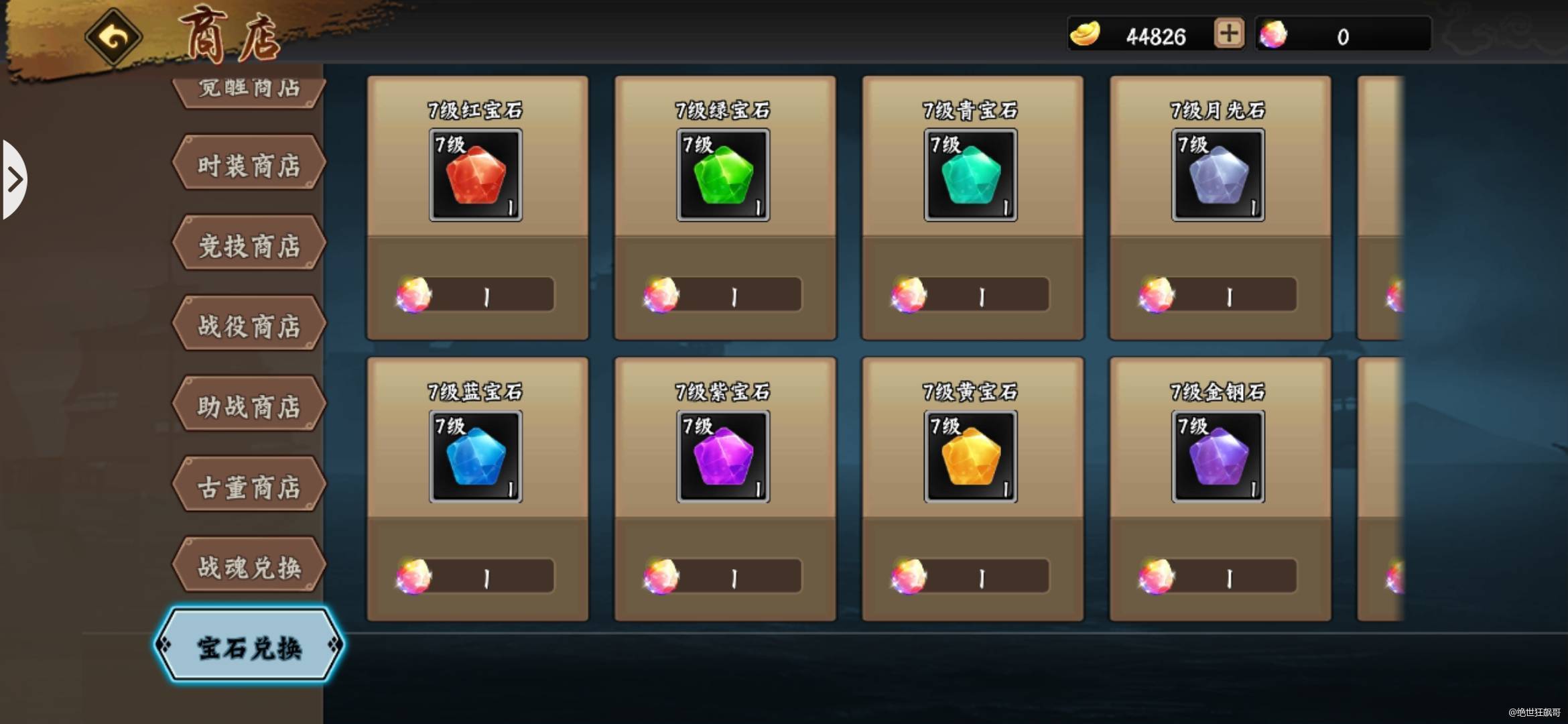 宝石兑换日常商店里有两种宝石可以用宝石精华兑换,一颗宝石精华可以兑换一颗7级宝石、五颗宝石精华可以兑换一颗9级宝石。 很多主公如果细心观察,就会发现7-9级宝石的中间跳过了8级宝石的兑换,所以兑换宝石的主公们建议8级宝石不要去用宝石精华兑换7级宝石合成,靠宝石精华兑换7级宝石再来合成8级就特别不划算了,兑换出来的8级石头再来合9级宝石就特别亏了,因为9级宝石只要5颗宝石精华就能兑换出来。宝石这个东