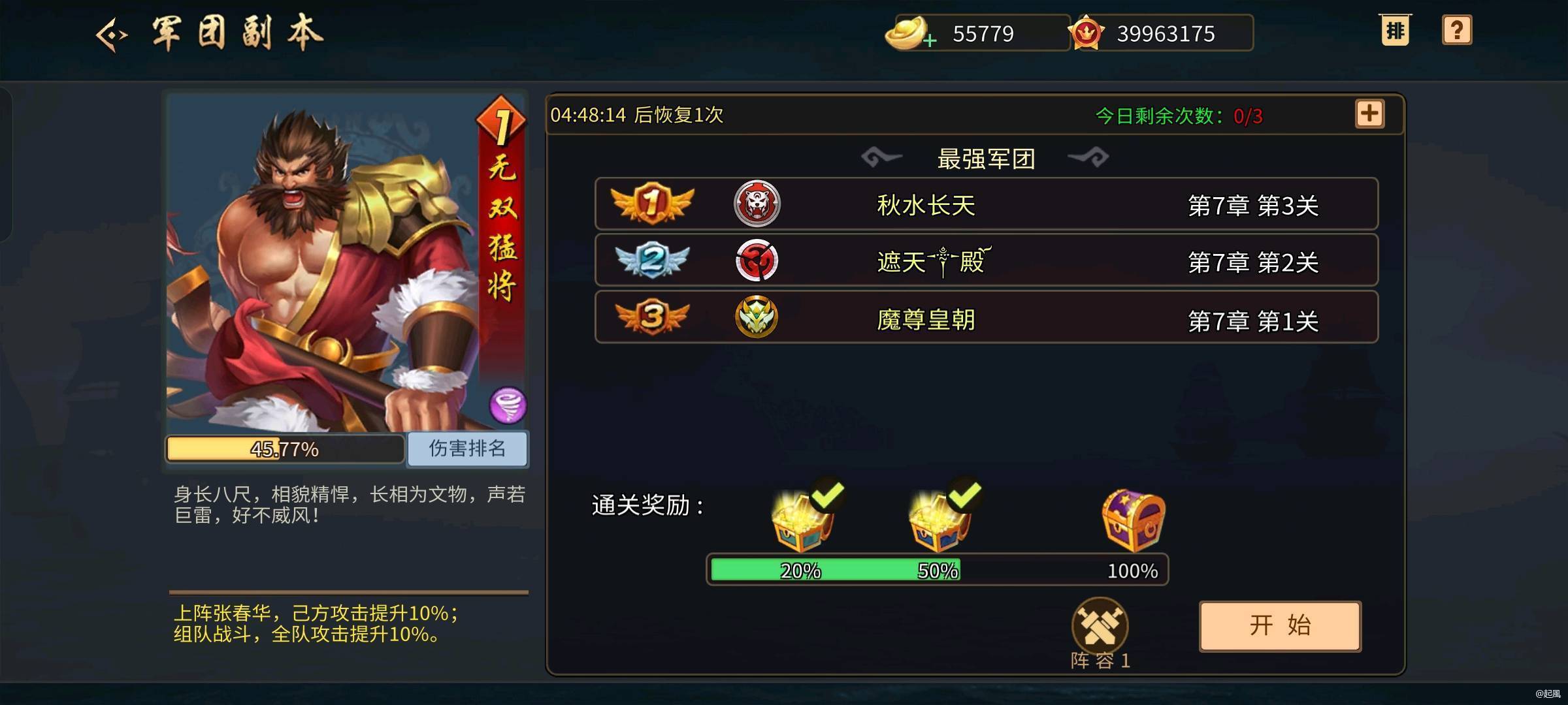 #攻略分享#军团副本第八章无双五虎通关攻略!!!! ①无双张飞 无双张飞为风属性,火克风,带武将张春华有10%攻击加成,道具推荐天师府+太清,武将公孙瓒+袁绍,高伤输出+强猛破气盾。 ②无双赵云 无双赵云为火属性,冰克火,带武将张绣有10%攻击加成,道具推荐飞盘+张凌剑(聚气为主)武将推荐吕布+马谡,属性克制输出伤害爆炸;也是第八章最好打的一个BOSS。 ③无双关羽 无双关羽为火属性,冰克火,带武