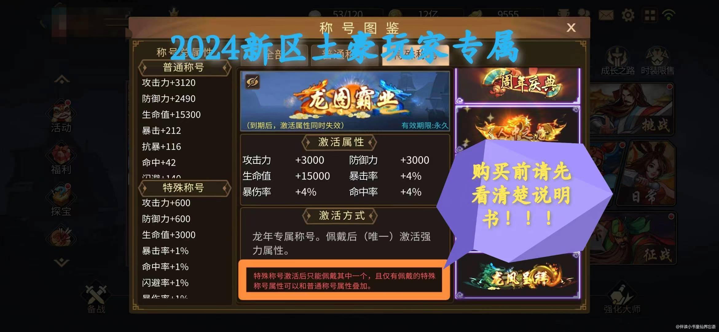 大家看了2024年的特殊称号,确实强劲,要比2023来得更猛烈些,不然新特殊称号怎么让缺乏“特殊称号”的玩家乐意购买呢!不过大家购买前请认准说明书,“特殊称号激活多个也只能佩戴一个,且仅有佩戴的特殊称号属性可以和普通称号属性叠加”!字小容易忽视,我们经常看到门店促销活动“三折起”,只是那个“起”特别小而已……意思很直白,就是你有钱可以买很多顶漂亮帽子,但是一次也只能戴一个,作用是一样的,非得有区别