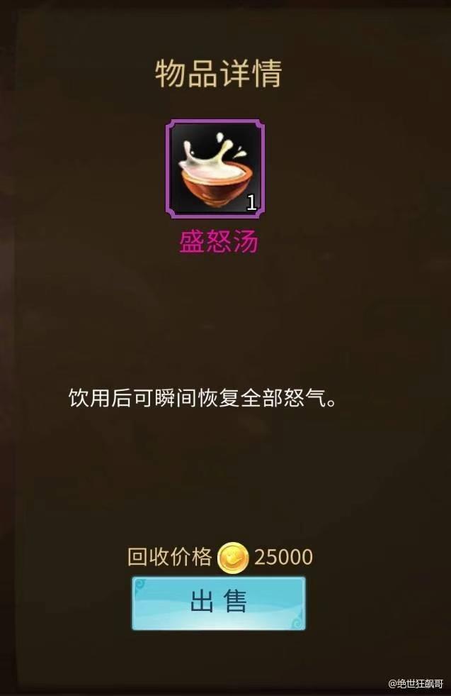 三国战纪最强最稀缺的最好用的道具盛怒汤(之前叫杜康酒)在高难度秘境,百战副本包括演武场助战,它可以瞬间爆气提供满怒,可以让主公武将瞬间放超级必杀技输出。 如果有主公前期活动获取到了,一定要好好珍藏起来,如果不慎卖了或者用了,可能后面助战高难度秘境和演武就没那么轻松通关了。 只有打喜欢组队助战打副本的主公,才知道用盛怒汤助可以让副本不在难打,基本上从建立角色到三国后期任务毕业只能在第二章和第三章副本