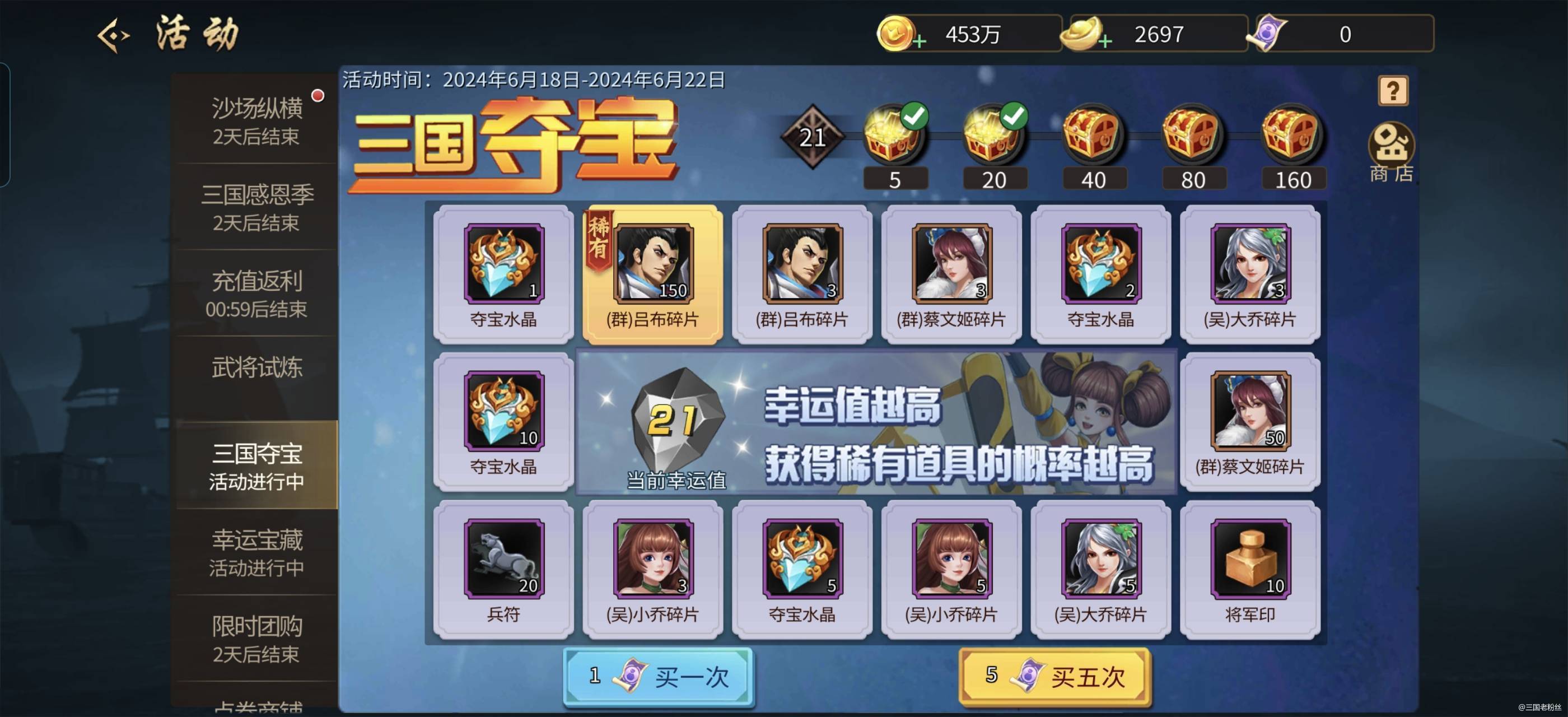 #攻略分享#每期夺宝,675元宝,或者2700元宝小博一下。 附上物品价值清单 橙色援军碎片价值60元宝1个。 印10个价值90元宝,兵符20个价值110元宝。 水晶价值100元宝一个。 紫色援军碎片无价值。 如图1,价值600元宝亏本75元宝。 如图2,则是赚的,而且5次,20次夺宝有2个宝箱可以领。 如果运气好,弄到10个水晶,或者50蔡文姬就赚大了,所以每次夺宝可以小玩一下,别多玩,1次或者