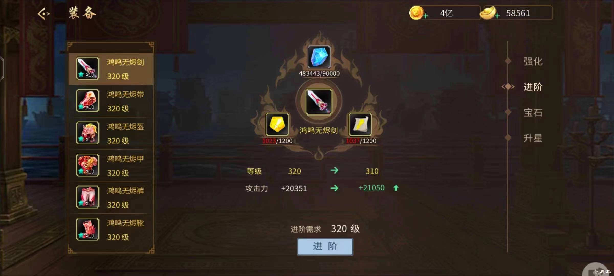 340装备,即将面世,多探宝,坚持每天金币探宝,时间就是最好的见证,340一套,也可以做到不差进阶石头!装备养成的意义,作为游戏的操控者,冠将是玩家体验的基础,装备则是辅助武将的的强装,如虎添翼! 包括六大神器,目前最高等级装备340级,每一级加的战力都挺乐观,通过普通副本累积装备图纸,原石,进阶石提升等级和进阶! 普通副本也有等级限制,因此提升主公等级是逐级提升装备的关键,以往的卡级只会影响游戏