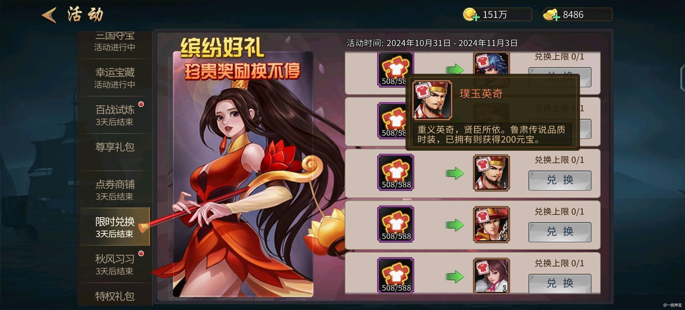#攻略分享#这次百战双倍活动又出武将皮肤兑换活动了,说说一些技巧和经验。 首先,时装碎片够的话可以直接兑换自己想要的皮肤,这次的公孙瓒的和孙鲁班的个人感觉可以,比较好看,虽然这两个现在不是一线武将了,不过收藏一下皮肤还是可以的。其他的属于老一点的皇冠武将皮肤。 2.很多玩家比如老区的可能有鲁肃皮肤,蔡文姬皮肤,董卓皮肤太史慈这些等等,如果时装碎片够不想换孙鲁班公孙瓒皮肤的话建议直接兑换已经有的皮肤