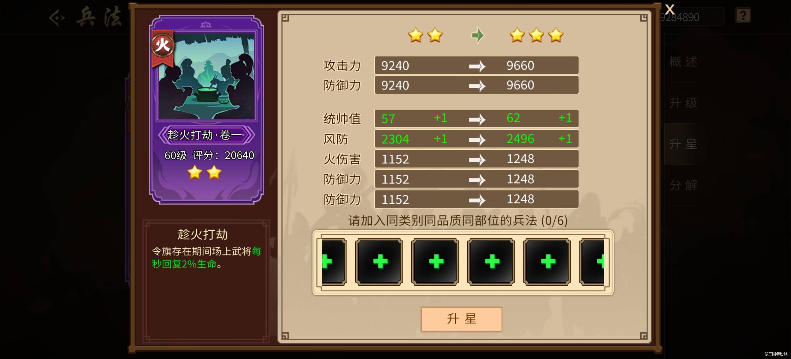 #攻略分享#【兵法升星需要数量】 橙色的 0星到1星需要3个, 1星到2星需要6个, 2星到3星需要9个, 3星到4星需要12个, 4星到5星需要15个, 每升级10级增加一个副属性,满级目前40级。 紫色的 0星升级1星需要2个 1星升级2星需要4个 2星升级3星需要6个 3星升级4星需要8个 4星升级5星需要10个 另外挑战任务里面有2星任务和30级任务,建议优先弄出来紫色2星和升级个橙色30