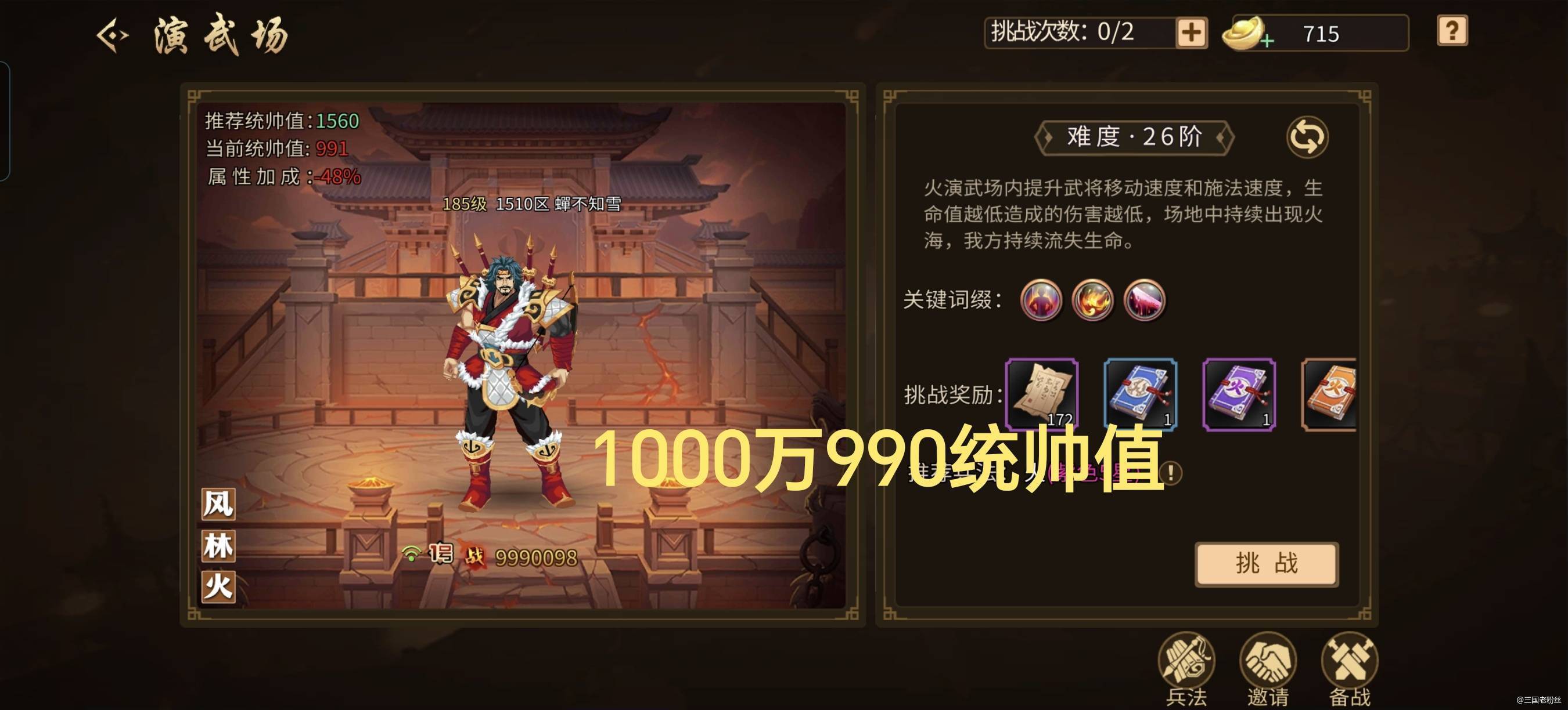 #攻略分享#【关于兵法如何针对性优先培养】 简单的说,就是优先堆统帅值,优先培养卷4,其次卷2,另外演武场只认上阵3主力的戴的兵法,援护加统帅值没用不带入演武场。 另外,集中资源优先培养一个40级出来,建议还是卷4优先,因为那个加攻击和统帅,40级满级后会随机强化一个副属性翻倍,以及系统挑战那里有30级,40级的达标奖励,大概能有1000多残片。 --- 如图,图1是我940万的号,单挑26很容易