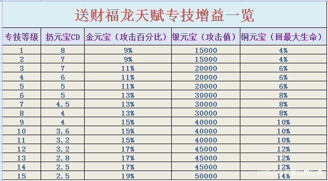 送财福龙改版解析 年宠待遇就是不一样,玩家不买账,立马改,如果新武将能有这样的待遇就更好了!言归正传,初版小福龙9级天赋专技“加4万攻击力、回蓝12、赋予10%生命护盾”,如今改版后调整为:金元宝+15%攻击力、银元宝+4万攻击力、铜币回血10%(9级数据)。综合加成不可谓不强大了! 三类元宝送财福龙随机丢出,是随机丢出、随机丢出、随机丢出!每次随机丢出一个元宝,丢出的元宝需要武将靠近拾取,buf