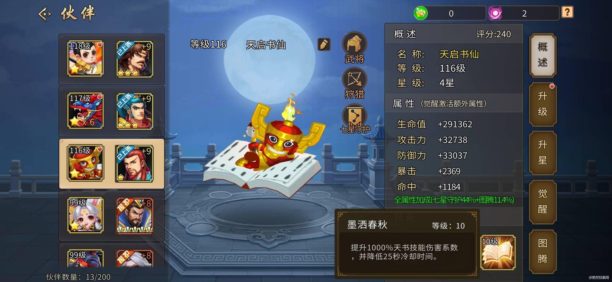 #攻略分享##战纪小科普##三国闲话#天启书仙目前是最优秀的极品橙色宠物,觉醒变异后的天书宝宝不仅可以让天书增加技能伤害系数还可以让天书降低释放冷却时间,大幅度缩减CD能让天书在难打的副本里可以多放一次天书,如此神宠谁人不爱!天启书仙可镶嵌专属战宠图腾可达15级,具体加成如下: 9级 900% 22秒 10级 1000% 25秒 11级 1200% 28秒 12级 1400% 31秒 13级 1