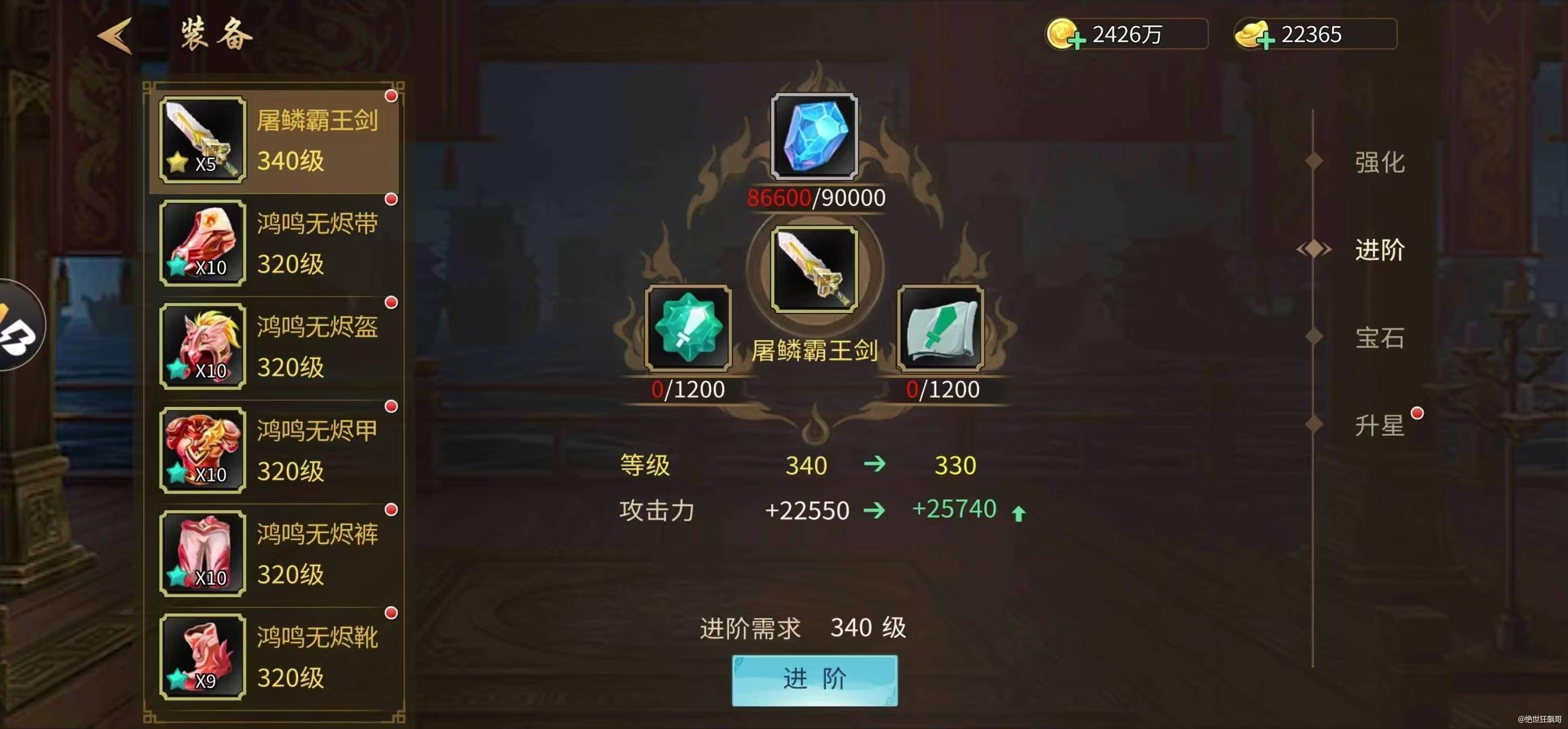 你们最所期待的340装备,终于出来的,惊不惊喜?意不意外?期待的有点高,最终有点失望,大宝剑最终加了2199攻击,战力涨了12754,虽然战力涨的不多,但是装备的战力真的是硬战力,比天书升一星还硬! 在这还是建议大家多探宝,坚持每天金币探宝,时间就是最好的见证,340一套,也可以做到不差进阶石头!装备养成的意义,作为游戏的操控者,冠将是玩家体验的基础,装备则是辅助武将的的强装,如虎添翼! 包括六大