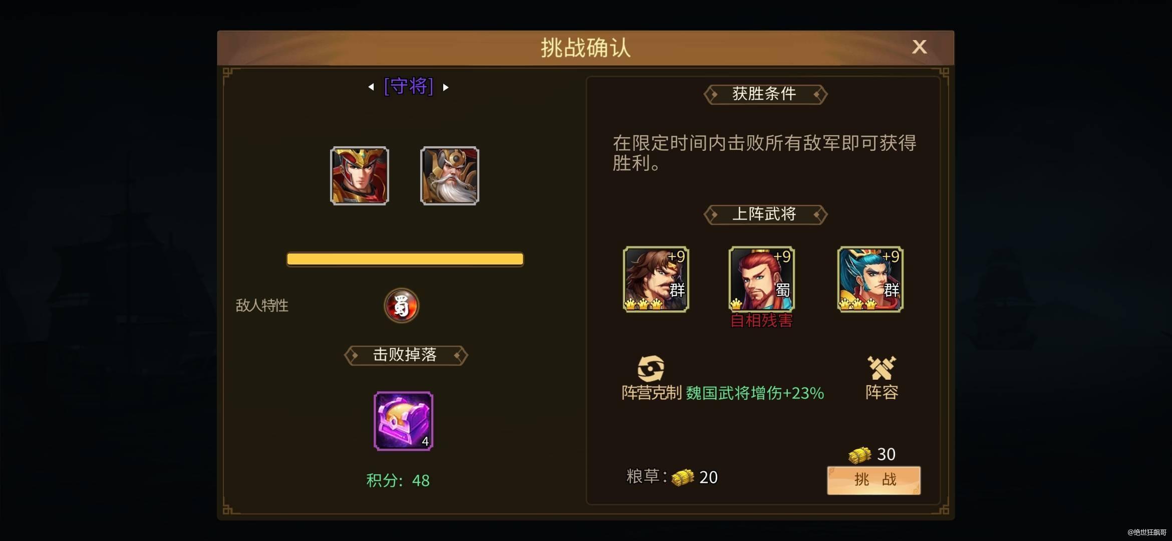 三国战纪援军令中蜀国里守关的无双马超和刘备是令主公们非常头疼的一个问题。对于很多平民主公们而言,确实是比较难打,虽然已经作了一些优化,但优化归优化,由于高等级战力受限的情况下,对于一大部分主公而言难度还是很大的! 那么接下来40年的手速,悟出一套由小编自创自编的一点打法分享给各位主公 1、首先上阵武将一定要首选魏国武将(魏克蜀)张绣,曹丕(光板武将不传承也行但需要配宠物和战旗)、(虽然武将优化了,