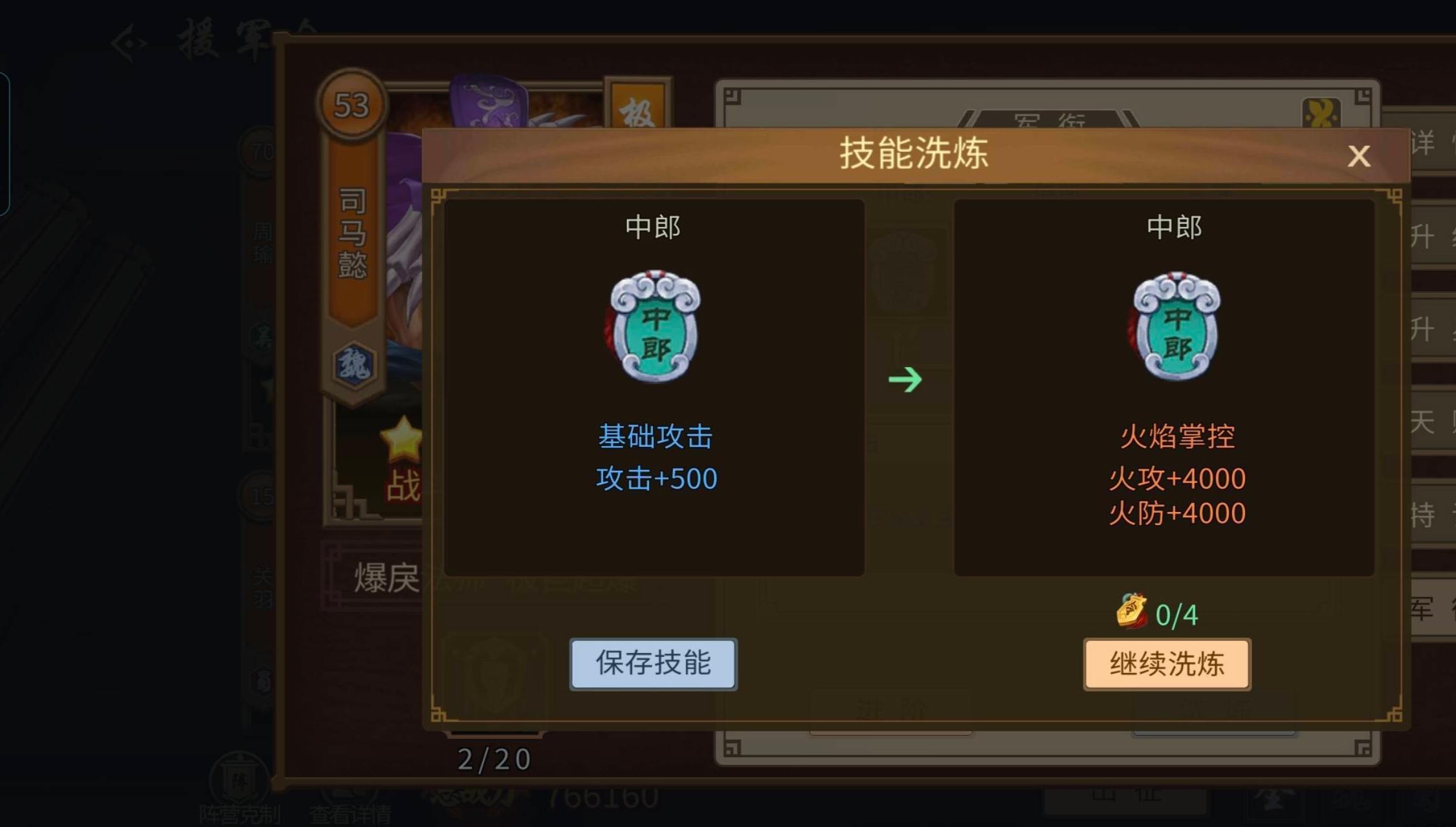 #攻略分享#给大家摸索出这东西的机制了,转发给群里兄弟吧。 这星期的攻城宝箱我没领,就等着更新,在我的区里这算是第一个橙色军衔技能了,就是没啥用,给司马懿洗个火攻,靠。。。 经过测试,袁绍佩戴援军司马懿,火攻加了4000,卸下来就不加,说明这玩需要戴上去才给主力加。 然后我把司马懿卸下来后,战力掉了1万多,说明这个洗练技能需要佩戴才有效果。 基本上摸索出来它的机制了,这东西就是类似于战棋宠物一样,