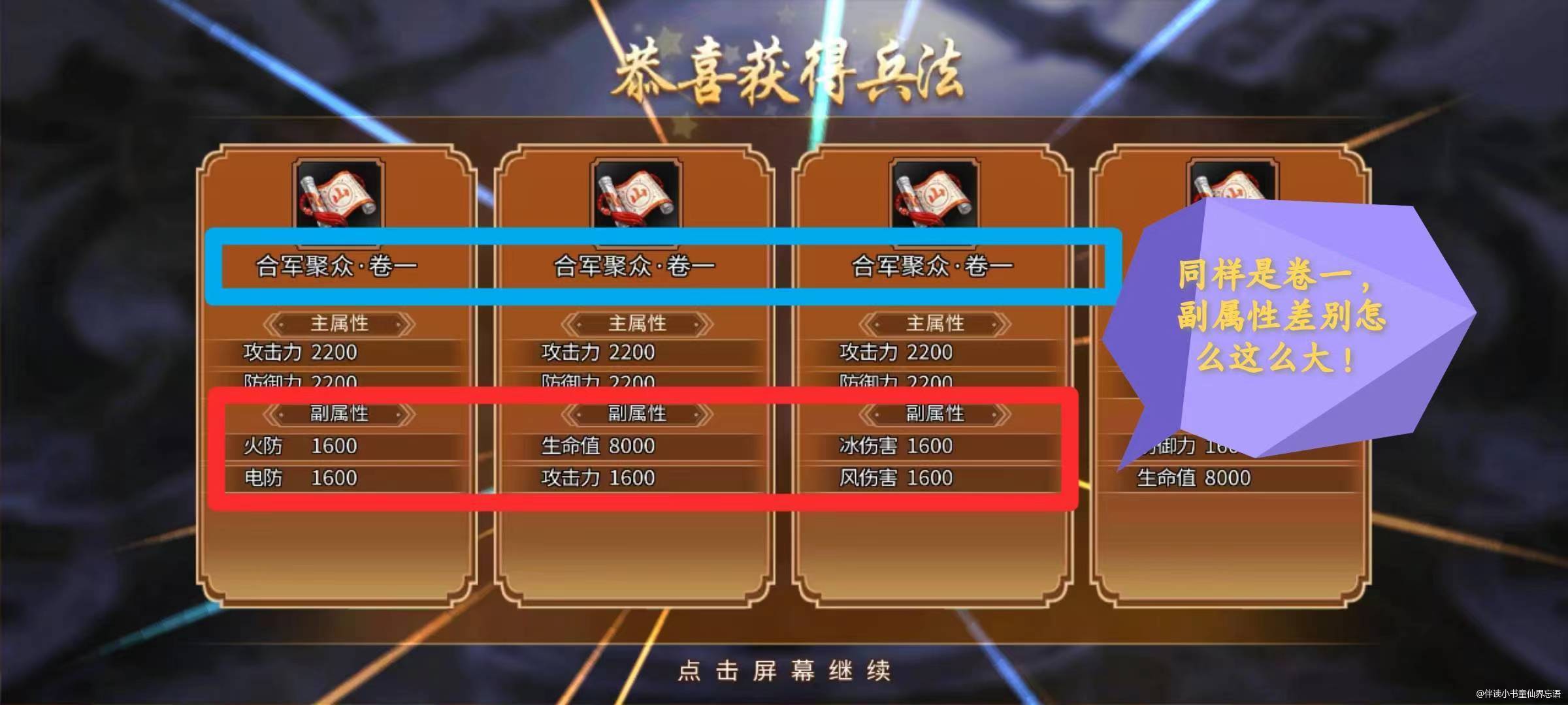 可以预见的是新版块兵法还是挺费元宝的。西域商队买橙色兵法宝箱,开出的兵法卷位随机,各卷位兵法主属性固定,副属性生成随机,极致追求属性的小伙伴容易纠结了,也容易废元宝!如果不追求副属性,花一定的元宝,三套主力橙色兵法还是好构建,相比援军夺宝开支相对小蛮多,前期提升战力效果也较为明显。估计这也是兵法出品初期吸金的最大原因,属性和战力提升较大! 兵法前30级,每升十级解锁一条副属性,上限5条,属性同样随