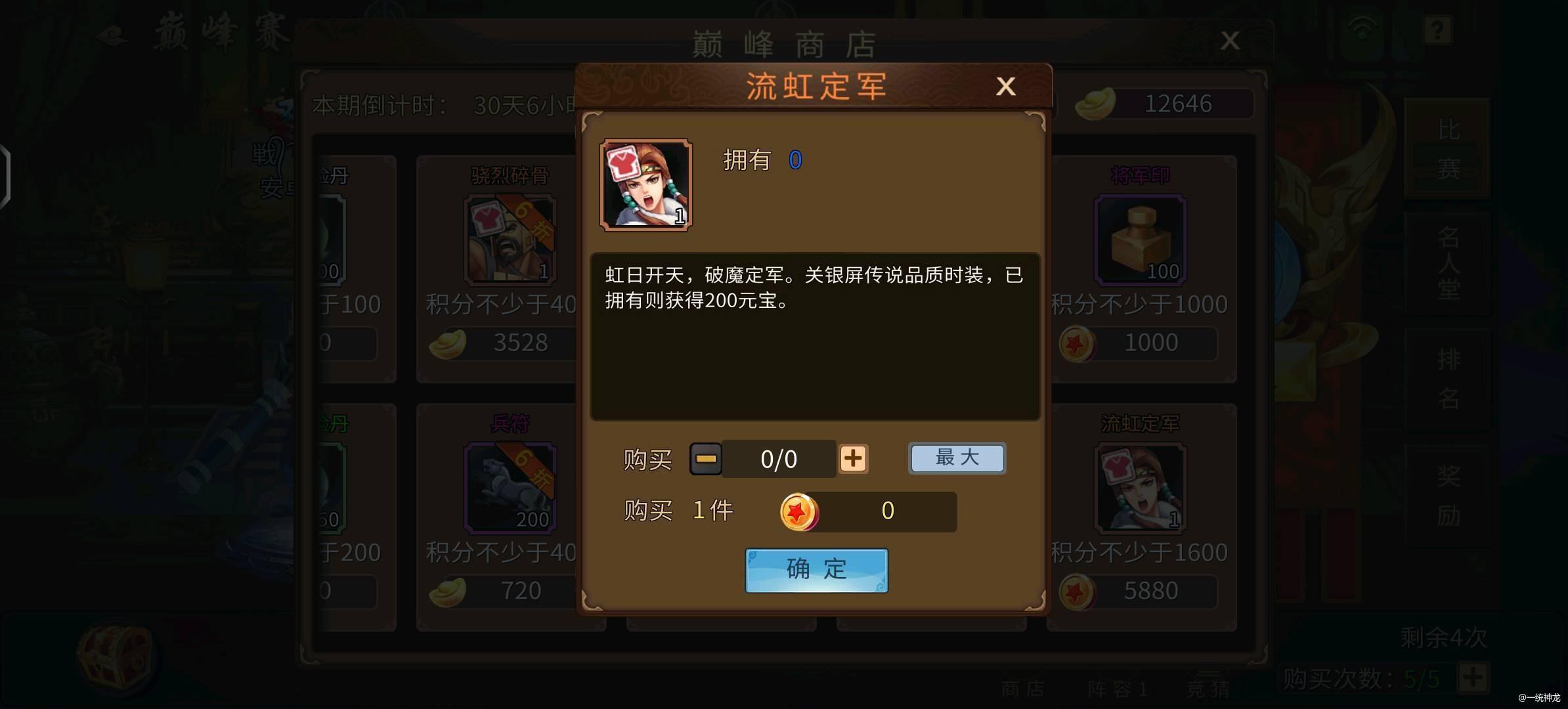 #攻略分享#新的一月12月开始了,记得巅峰赛商店里的能用竞技币兑换的东西都去兑换一下,时装的话关银屏的时装想换的可以换一下,没有武将没关系,先把衣服时装换上去再说。 多余的竞技币拿去首先换将军印和经验丹,还有多的话再换兵符。 积分不够的每周多打一两把也没关系,前面3把每次也就10元宝,想拿时装就得努力打到1600分才能有资格兑换。 战役箱子记得等战役双倍活动结束之后第二天白天再一起开箱子这样容易出
