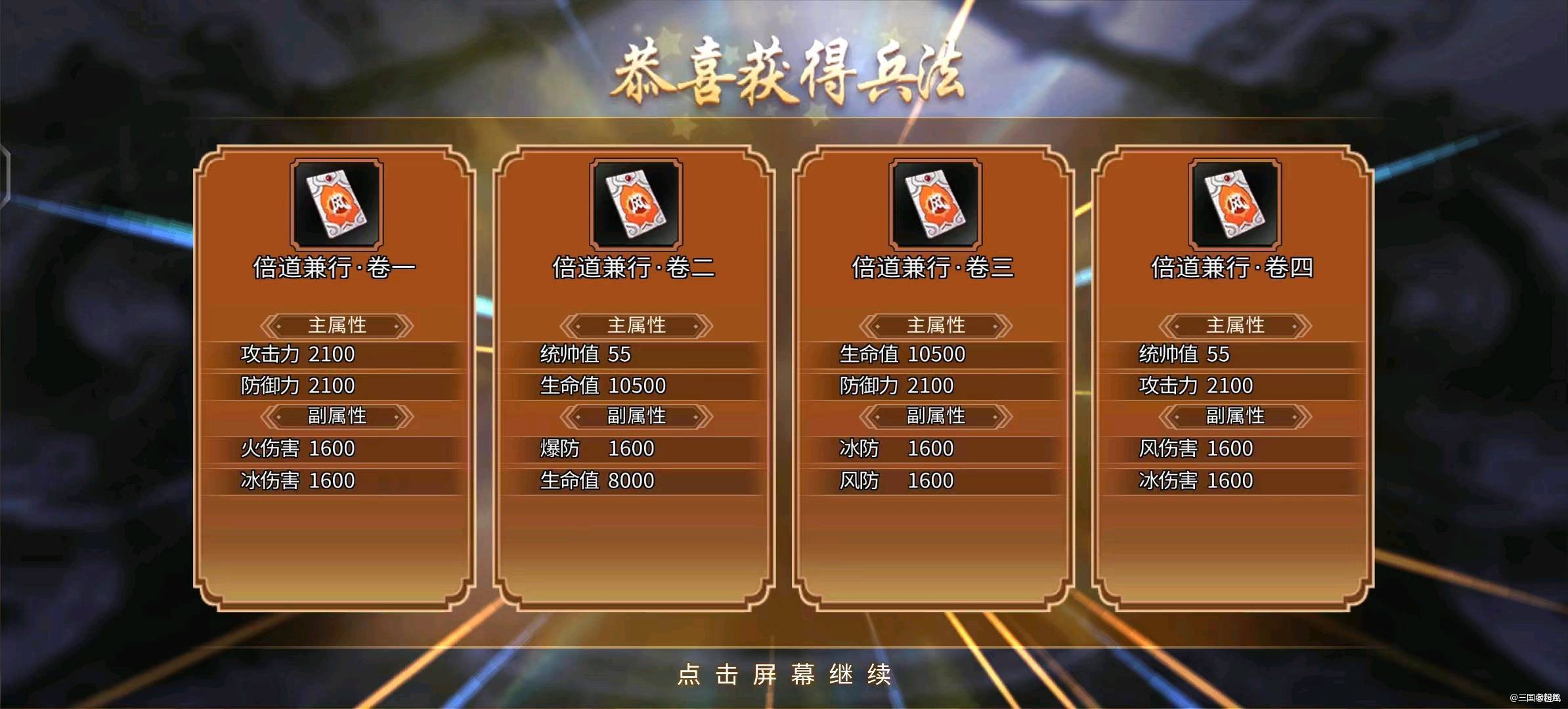 #攻略分享#【关于兵法如何看好坏】 兵法主要就是看副属性的,因为主属性都一样固定不变的。 兵法一,四是攻击的。 二,四加统帅的。 然后就是如图片这样的副属性,开出来带攻击,或者统帅值就是第一档次最好的兵法,其次开出来属性攻击的,就看个人需求决定培养。 前期的号都优先培养第二,四部位,统帅值培养起来,后面演武场才更容易打。 新手前期别乱培养,不然后期开出来极品兵法,你重铸的话,很亏的,至于亏多少,请
