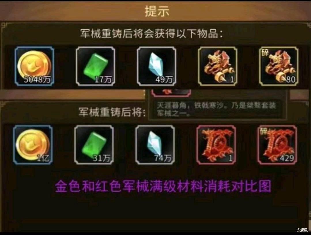 #攻略分享# 搞一套7红色军械套相比7天命套能加多少战力? 今天官方发了红色军械相比天命军械的属性对比图,刚好我有7天命套,上号简单做了下测算。 目前我培养的天命军械总共加战力大概32w左右,红色军械属性全面提升20%, 那么按照直接战力加成20%计算,也就是全套7红色军械精炼强化同样等级可以加战力6万到8万战力。 就是升级相比天命套无论是碎片需求量还是精炼石和精钢石,都有非常大幅的上涨,不过养成