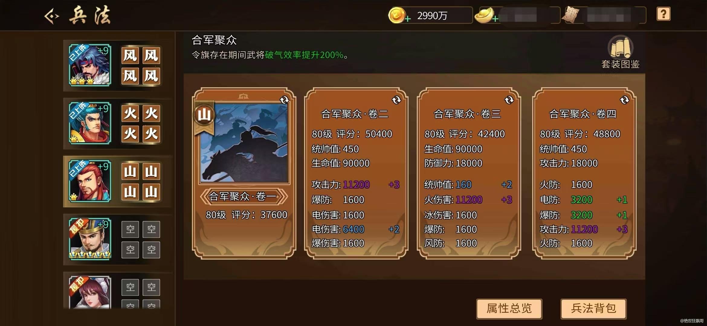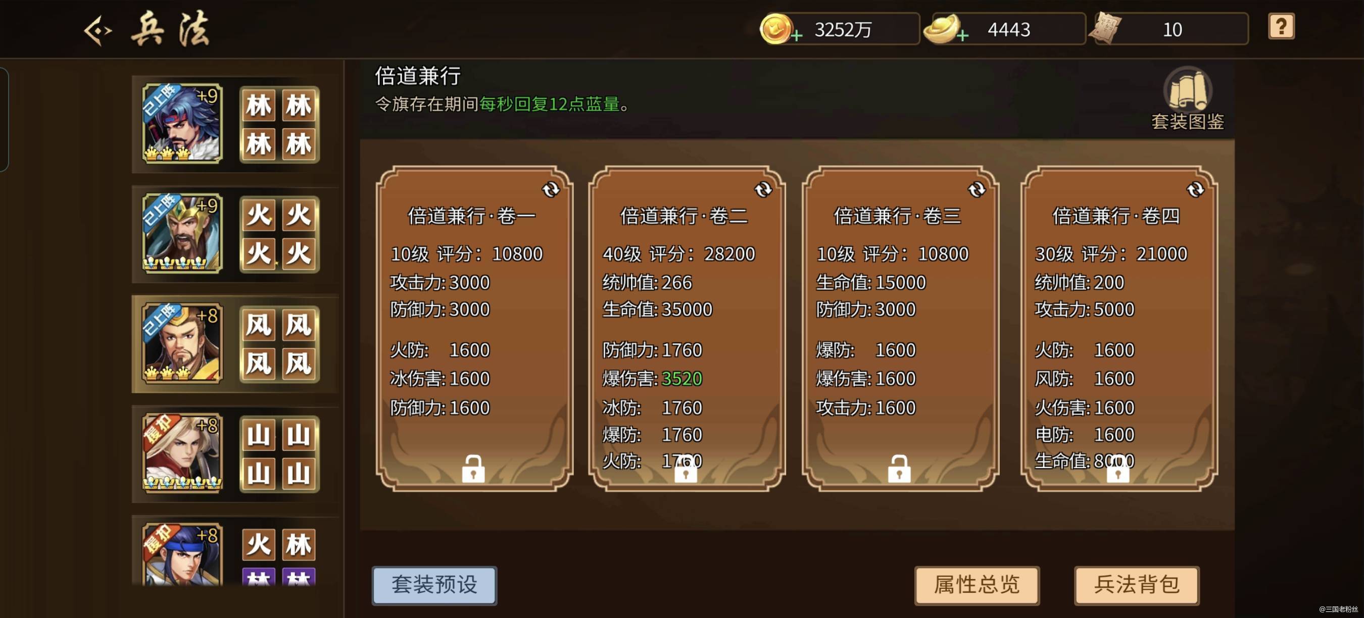 #攻略分享#【关于援军令培养和短期毕业】 我1000多万战力的号,号算不上好,也不算差,目前就4套兵法,风火山林。 我现在优先把风兵法的2和4卷培养满级40级, 然后再把林兵法2和4卷培养满级40级。 火和山的24卷就先20级就好。 剩下的所有兵法都先升到10级。 这样我无论打什么演武场,我都必带风和林2个主力兵法,这样可以保证我的统帅值足够,剩下一个兵法就看地图随便戴了。