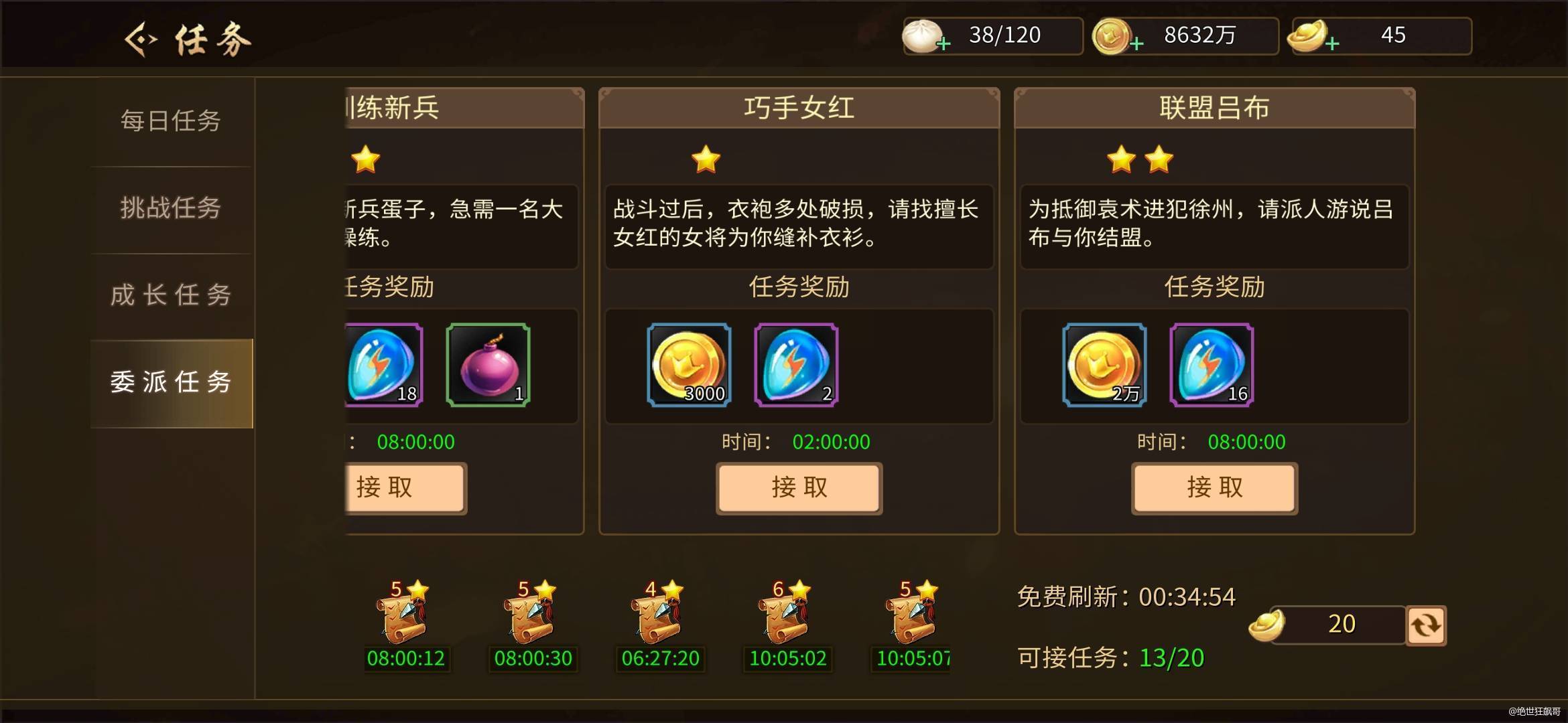 传说委派任务宝箱子,个人认为这也是目前游戏中最好看的箱子,金黄金黄的外观,闪闪发光就好像一个极品大宝箱一样,但建议这个宝箱里的宝物建议换一下或者增加更多实用性的道具,换点援军小材料,进阶石,精炼石,元宝都行的,还有这个委派任务,目前好像都是1星2星3星4星5星委派任务多一点,6星委派任务好像出来得少一点,新武将很多都没激活就有委派任务了,有的新武将委派了在任务中就有有新的委派任务来了,有的激活了没