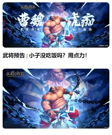 我一直都赞同曹魏“虎卫”系列武将,是最近两三年里最成功的武将天团!虎卫张辽和虎卫张郃都很成功。免控增伤的虎卫张辽和如影随形的虎卫张郃,这对虎卫急先锋凭借炸裂的伤害和连绵不绝的攻击,在强将如林的竞技舞台中硬生生打出了一片天地,虽历经优化现如今他们依然活跃在特定的竞技场中,成为了PVP赛道的常青树…… 那么即将在街机节降世的虎卫许褚,有着肉坦重装的别称,能否延续经典再创辉煌!答案是肯定的,我认为竞技打