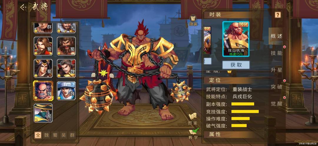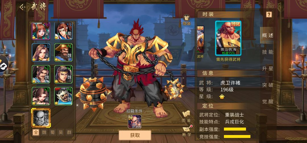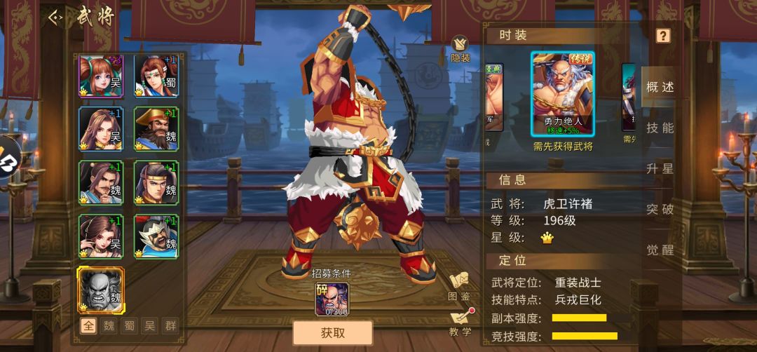 虎卫许褚强大的生存能力和控制能力 竞技场:在竞技场上,虎卫许褚可以作为前排坦克,利用熊威形态的高额伤害减免和禁止切将的特性,为队友创造输出环境。同时,犀甲形态下的高伤害增幅和控制技能也可以对敌方造成不小的威胁。 副本:在副本中,虎卫许褚同样可以发挥其强大的生存能力,为队友吸引火力并承担伤害。此外,其控制技能也可以有效地打断敌方的技能释放和连招。