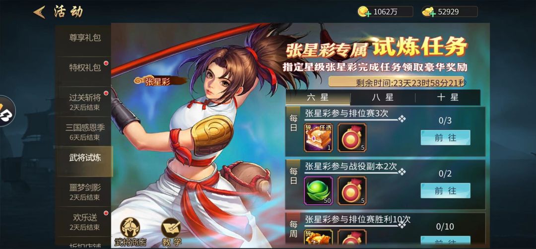 #攻略分享#张星彩兑换的活动如期而至,相比虎卫许褚的试炼任务还是略好一筹!我个人建议只有双能武将才值得培养至三冠,一方面拿资源另一方面可以让副本和竞技能力更上一层楼!回到正题:张星彩作为一个竞技武将,可能会是大多数生活玩家会选择一冠,由于一冠武将能拿到的资源有限,如果在活动开始的当天你就开始任务并且在活动开始的那一周还没结束时就买任务次数则可以多领取一周的周任务奖励,对于新手玩家而言我建议:高级符