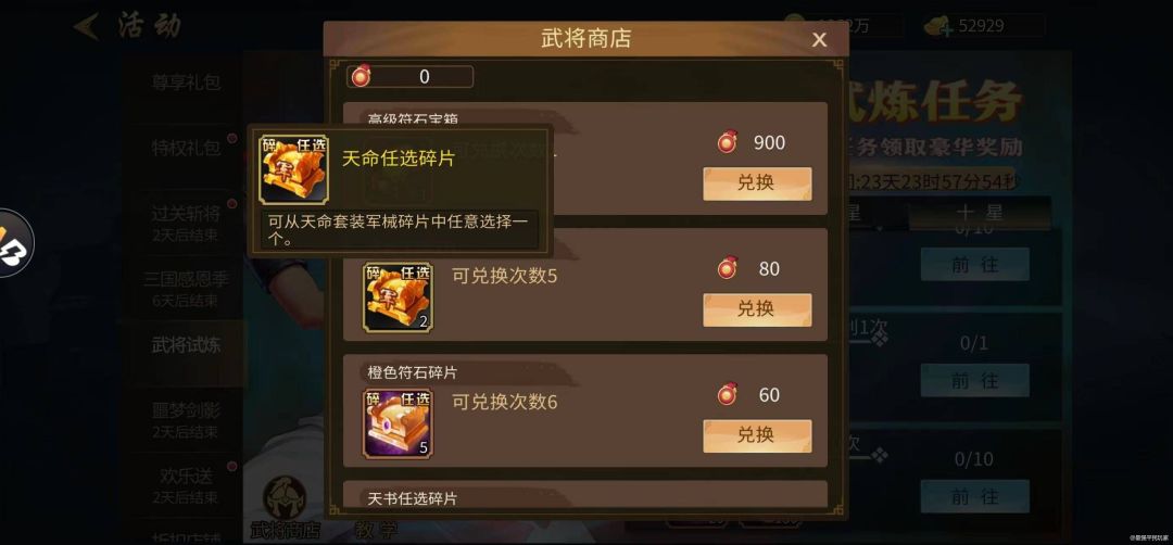 张星彩武将试炼活动任务马上就要结束了,有朋友问我该如何选择兑换的资源,我个人认为:对于新手玩家而言我建议高级符石箱子首选,毕竟在新区中稀有或极品符石立时能够带给大家可观的战力增长,让你无论在竞技还是决斗场以及群雄争霸中更具有竞争力。而天书任选碎片以及天命任选则可对手游中后期玩家的助力阵容打造起到一定的帮助作用,至于武将碎片、符石碎片、精钢石之类的资源还是请玩家审时度势进行兑换!