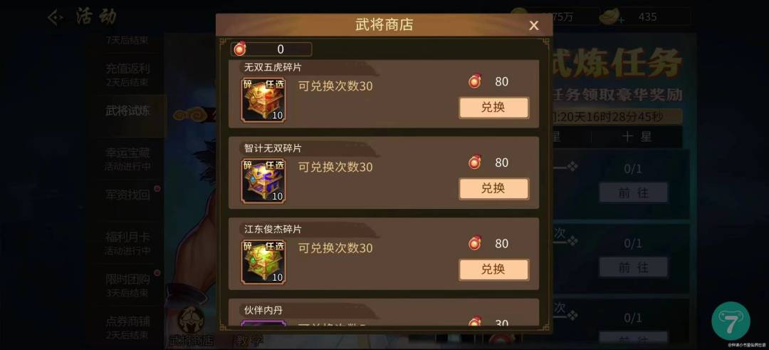 #相伴八载##攻略分享#其实兑换在三国战纪手游也是一种学问,公孙瓒试练活动即将结束了,有人问我8.18新武将有没有类似的活动,我感觉没了,就算有我个人感觉只有双能武将才值得培养至三冠,一方面拿资源另一方面可以让副本和竞技能力更上一层楼!回到正题:一冠公孙瓒能拿到的资源有限,如果在活动开始的当天你就开始任务并且在6.15的那一周还没结束时就买任务次数则可以多领取一周的周任务奖励,对于新手玩家而言我建